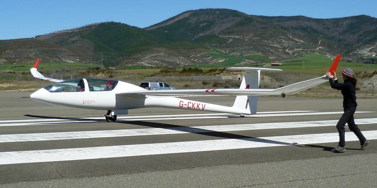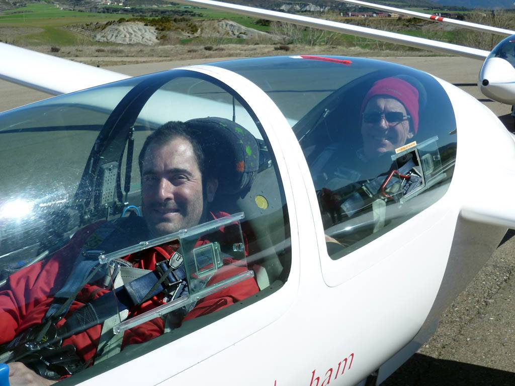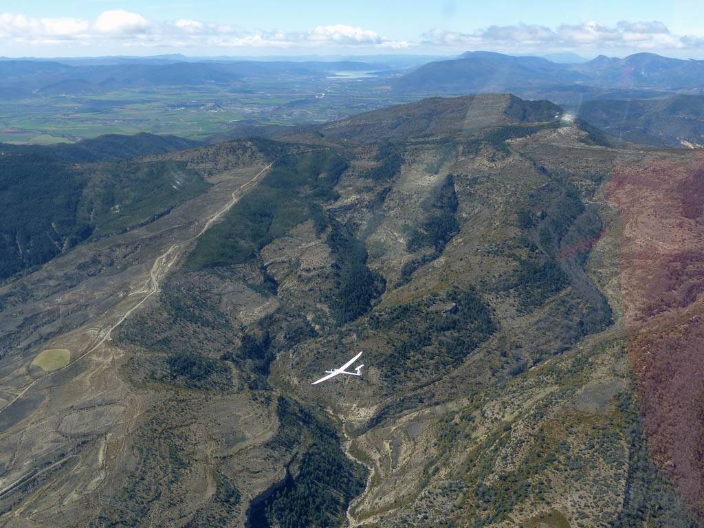 I launched just before midday with John in the DG1000. We released over Javieregay and thought I'd mucked up again. But we found lift marked by the vultures after bowl bashing Stage 1 again. We spent ages there and eventually got to 6500 feet. From there we explored, flying over the top of stage 1 and to the fire break ridge to the East which was kicking off limited lift. Once we got back up to 6000 feet we set off for Stage 2 which we attempted to ridge soar with two other local gliders. But it wasn't working that well, so we escaped along the valley back to Javieregay. From 5500 feet we pushed west into the Jaca valley to cumulus. But we couldn't get it to work for us. So with it getting marginal for gliding back we returned to Santa Cilia to land smoothly after 1h51m. It was an unspectacular difficult flight but still the scenery was awesome. Other pilots apparently found wave Northwest of Stage 2 to as high as 11,000 feet but we didn't have the height to go there anyway. Never mind it was still a good fun last flight.