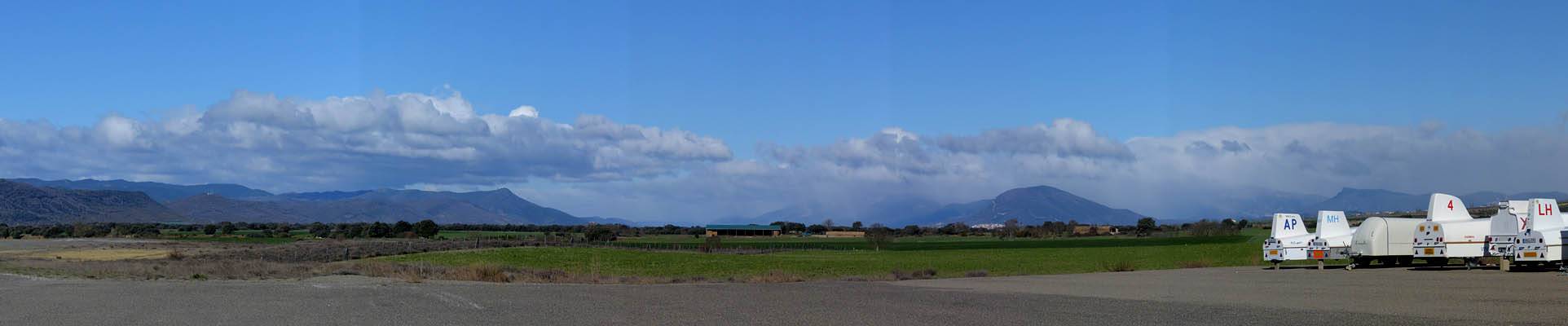 | 360 degree panorama and a view of Cuculo as we retrieve the DG1000 after its last landing of the day as sky fills with rapidly lowering cloud. | Two views of Oroel ten minutes apart showing the incoming moist air. | ||