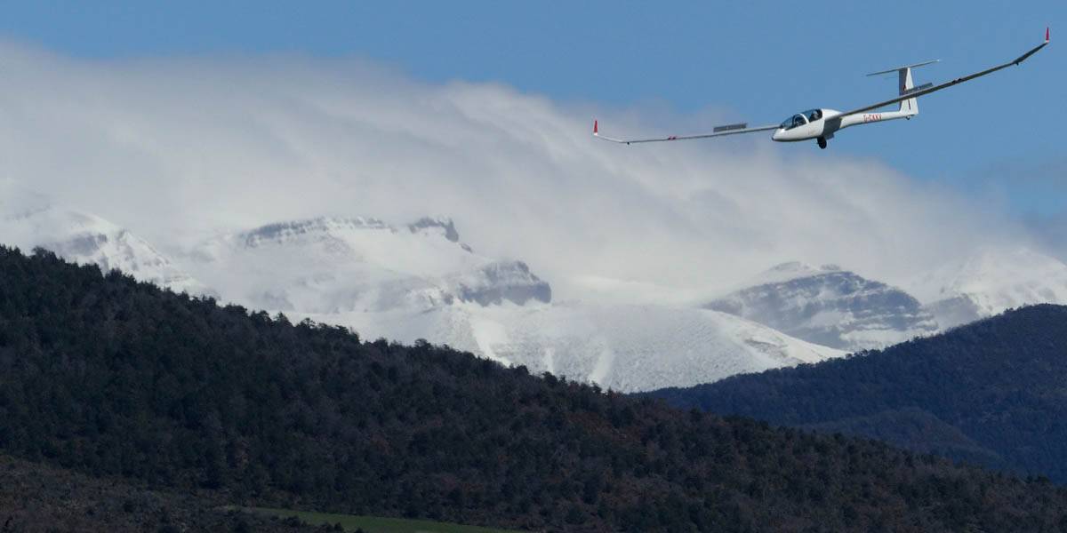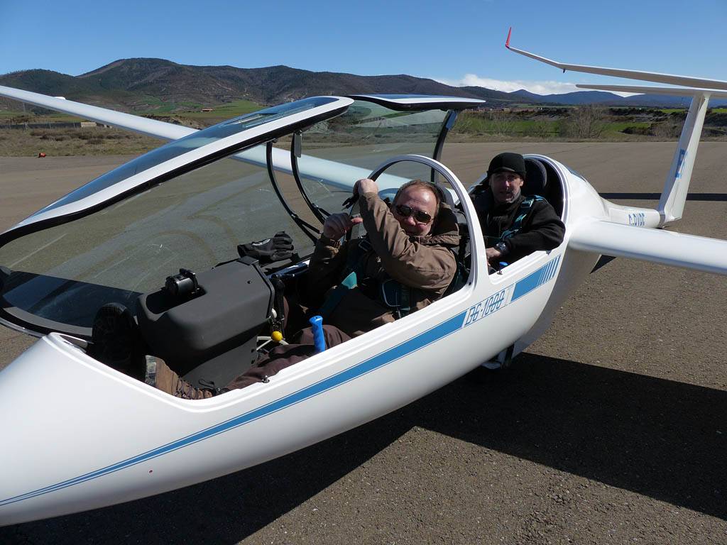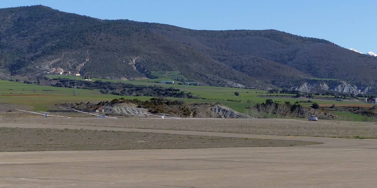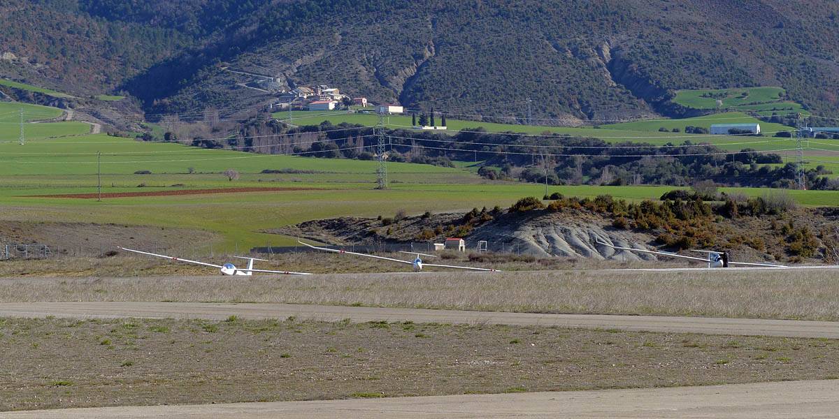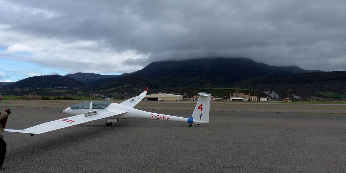 | A frosty clear start at the summit of Cuculo. | Getting the gliders ready to fly. | Towing to the launch point with Oroel in the background. | Cumulus developing to the West and seemingly going to showers. |