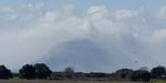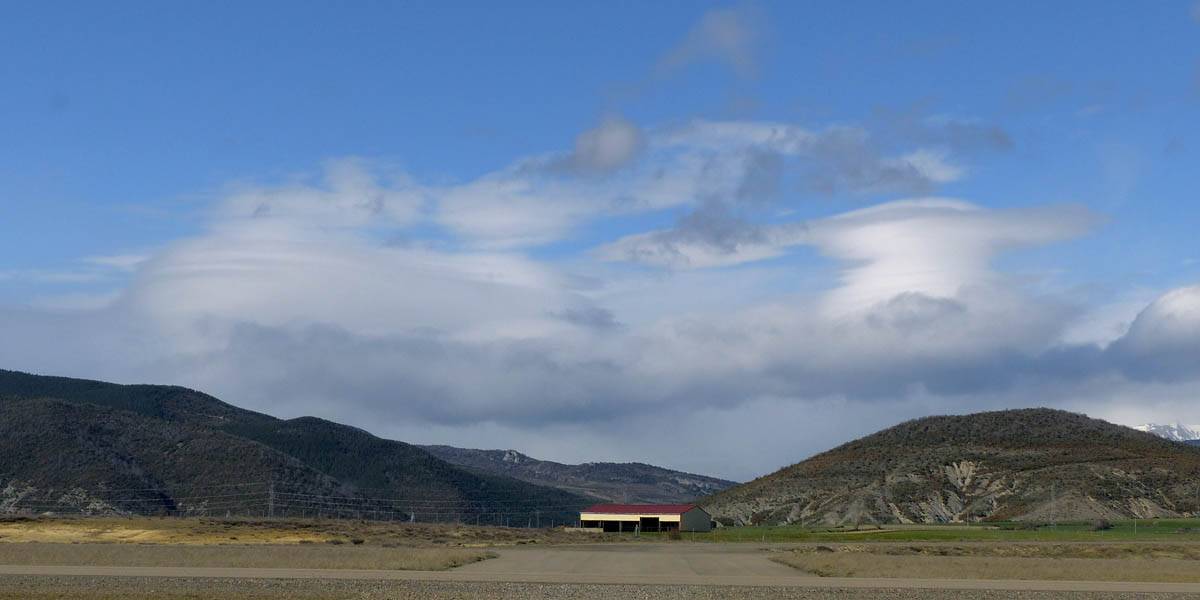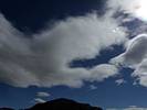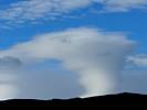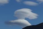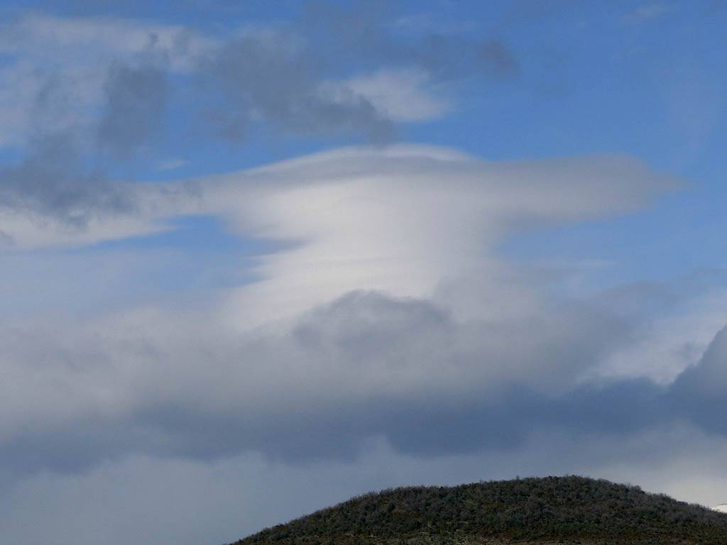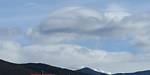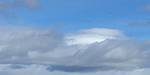 | A view of twisted tortured rotor cloud under the main wave cloud. | A faint rainbow to the Northeast as a small shower appears to obscure the peaks. | The wave clouds continue to evolve and take on all sorts of spectacular shapes. | This lenticular resembles a tornado. | One more cumulus and lenticular shot to the West. | ||
