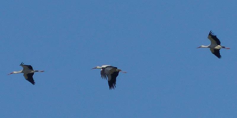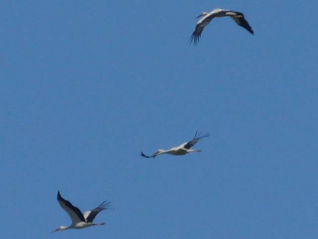 | Inspecting a soft tail wheel. | Crystal clear peaks to the North are very beckoning. | Ready to fly another day. | Storks flying past. Curiously they were going East to West. I thought they migrated North at this time of year. | ||