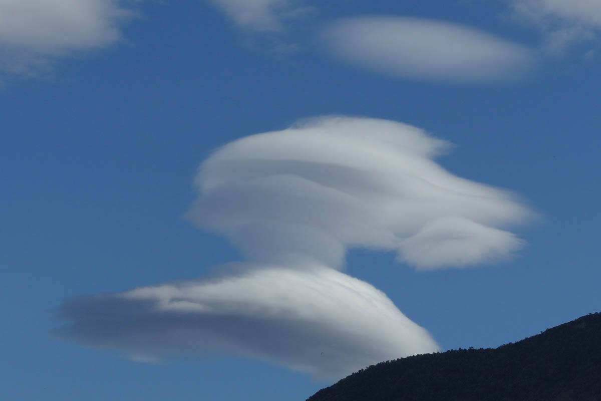 | A panorama of the peaks to the Northeast. | Once again moister air to the West shows off some beautiful UFO style wave lenticular clouds. | ||