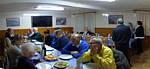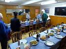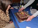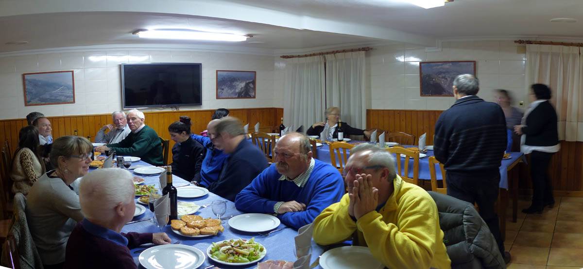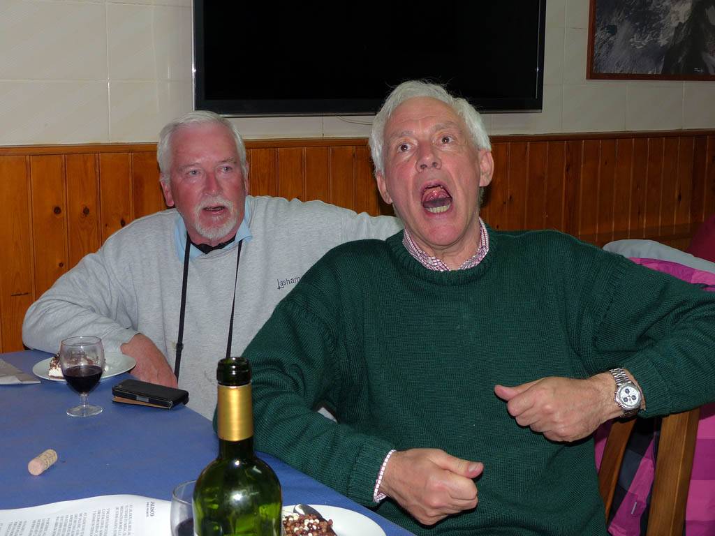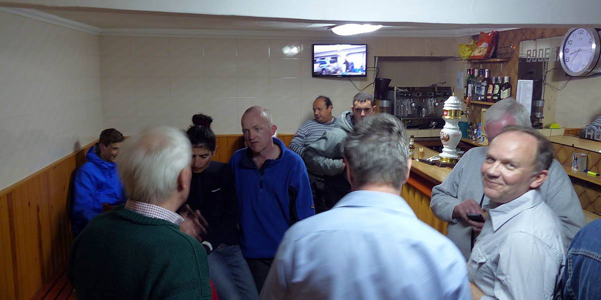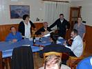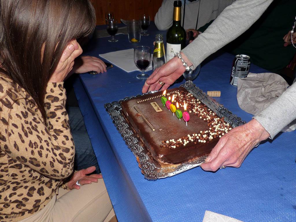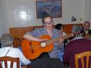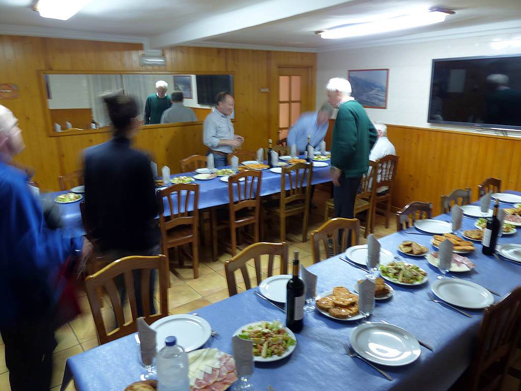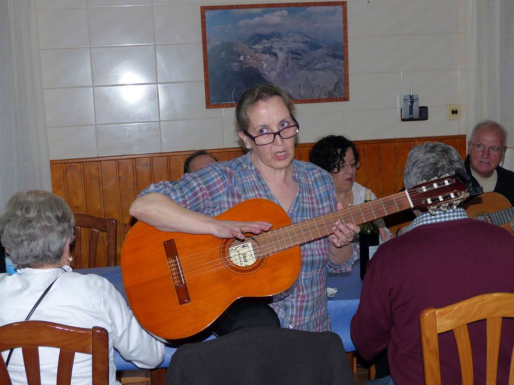 | Gathering in the bar. | Assembling for dinner. | The guitars soon come out after the main course. | Paul's wife was given a surprise birthday cake. | After some Spanish songs, countersinging 'Jerusalem'. | Toya playing the guitar and singing. | |