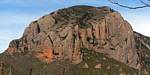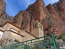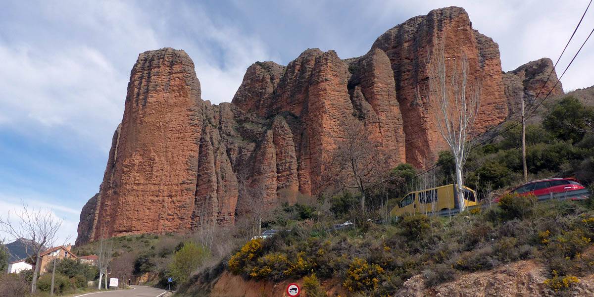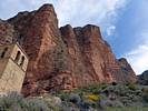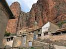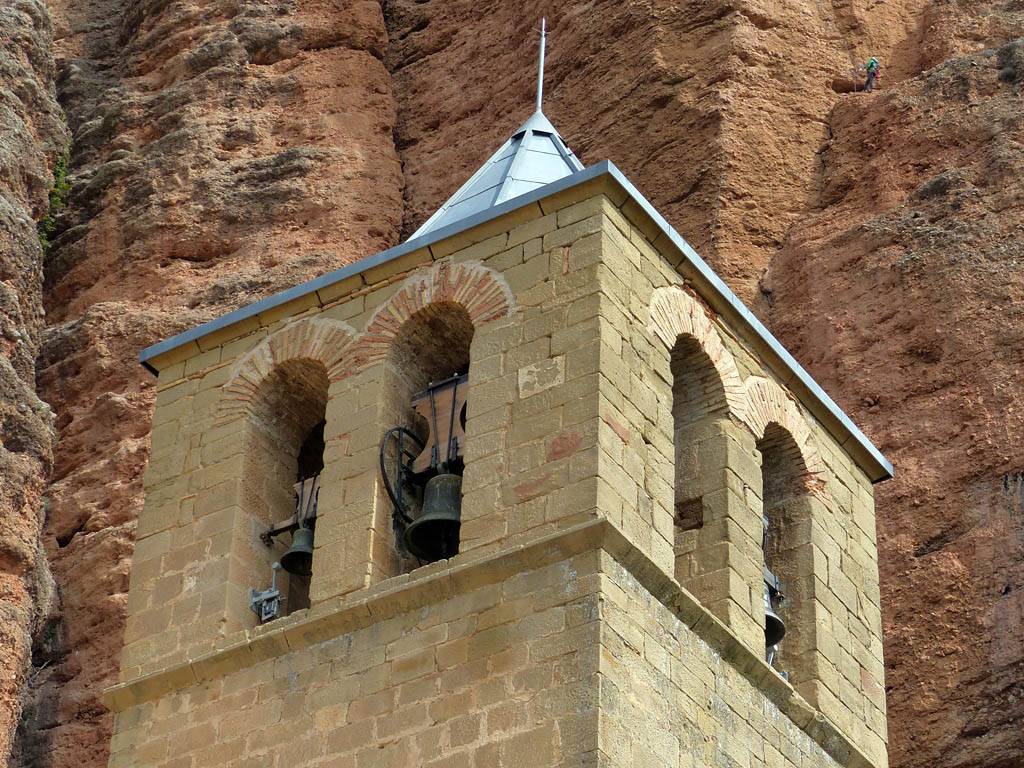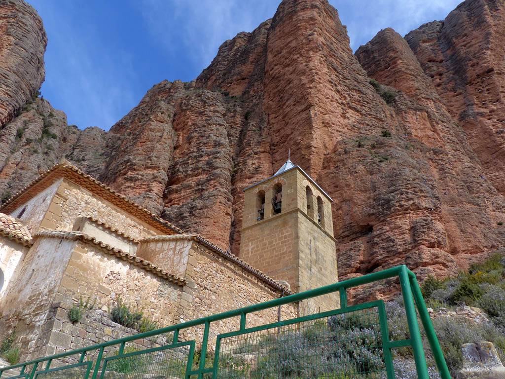 | The sandstone cliffs of Riglos. | Across the valley is what looks like a large granite tor. | Looking up at the cliffs as rock climbers have fun. They look like ants against the massive cliffs. | The church below the Rigloss cliffs. | ||