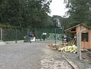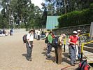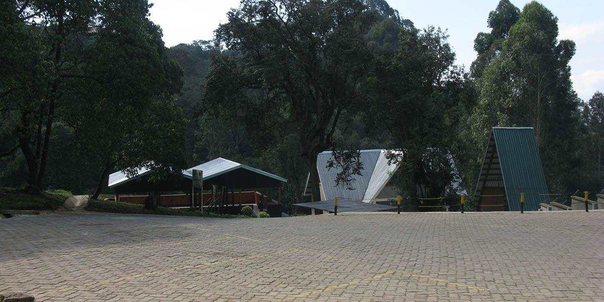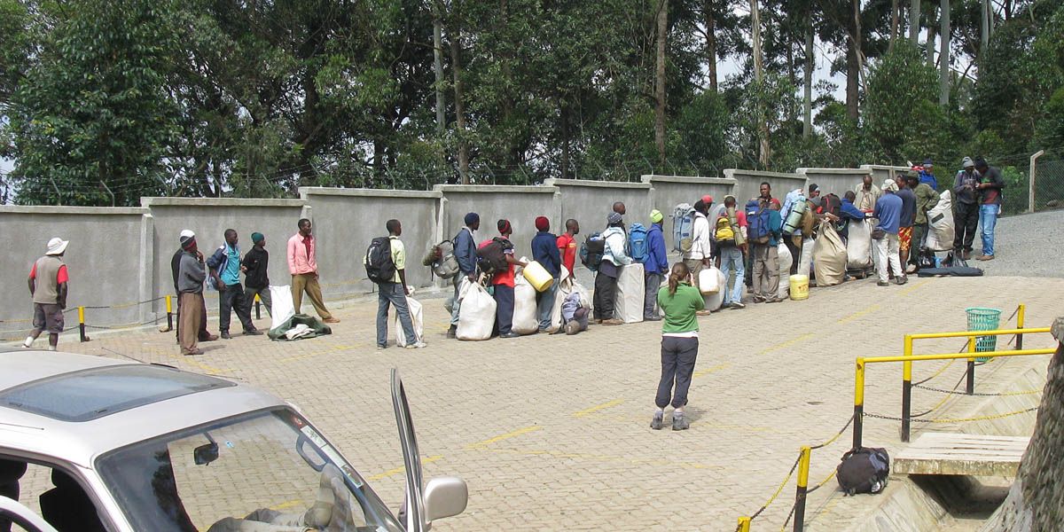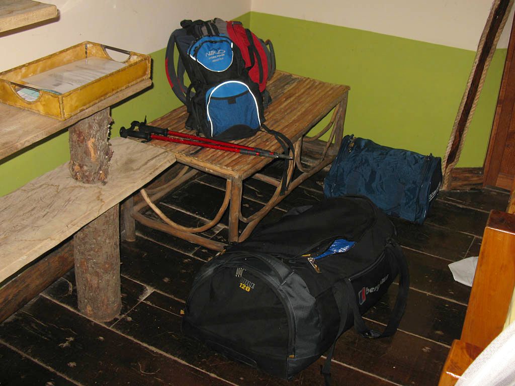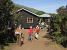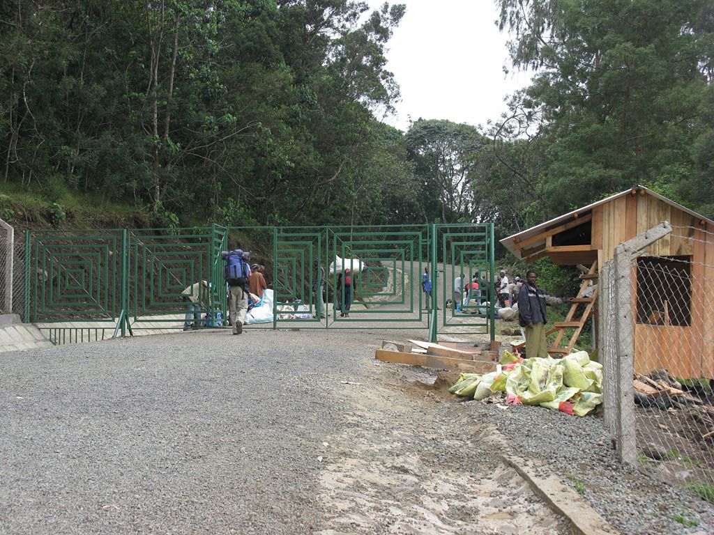 Waiting at the gate for all the gear and porters to be sorted out. | Looking downhill to the lower huts and the sky and plains below. | Park regulations and estimated times between camps. |