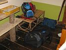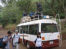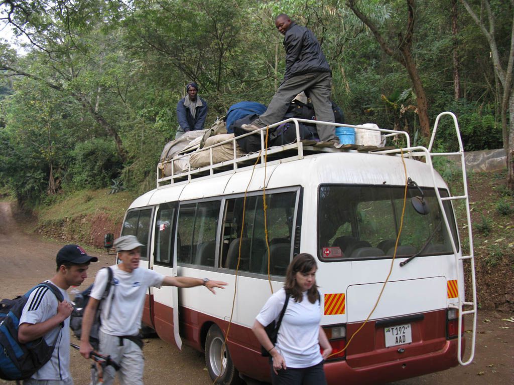 Early in the morning all my gear is repacked and ready to go on trek. The blue bag is travel clothes to leave behind. | A beautiful sunrise at Karama Lodge. | Loading the gear onto the bus. | Boaz, Yedidya, Anne, Bob, David, Misha and Mike. | Looking at Mount Meru as we drive East along the highway from Arusha. | Approaching the Machame Gate. |
