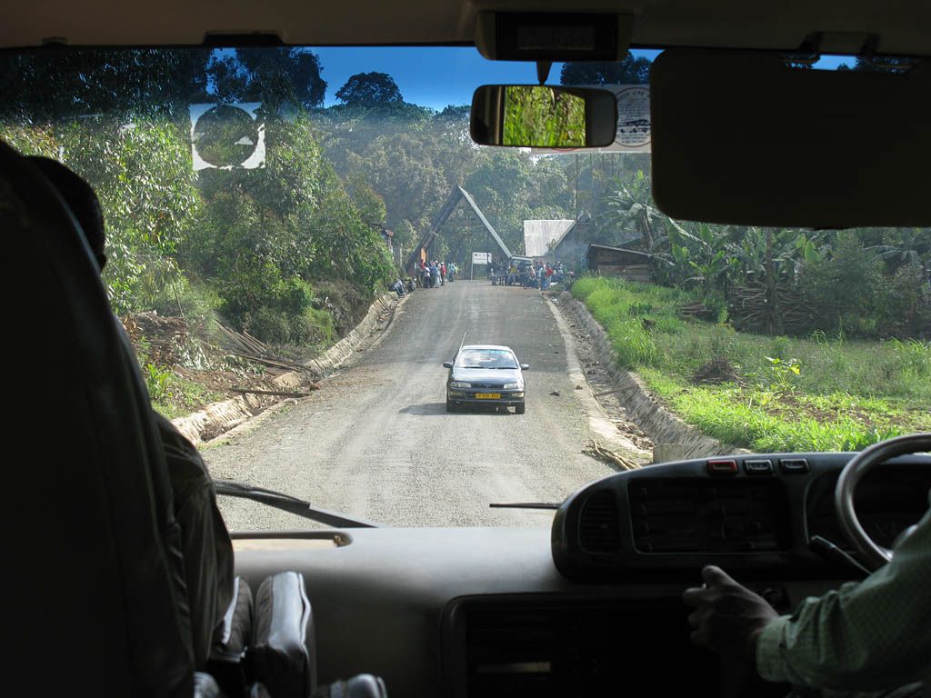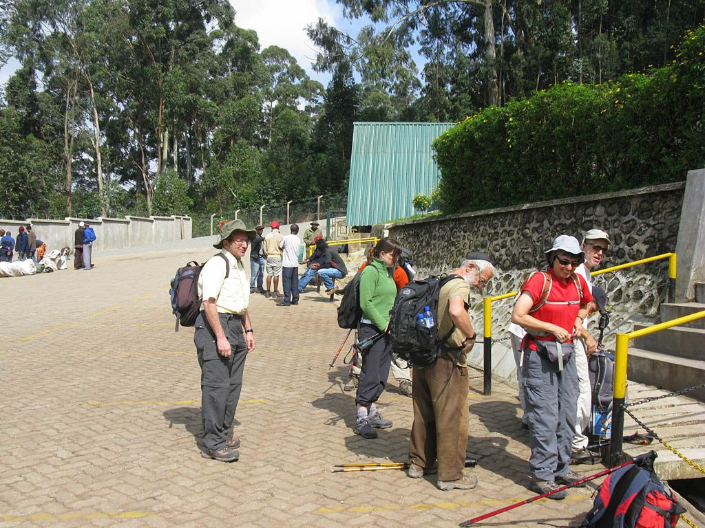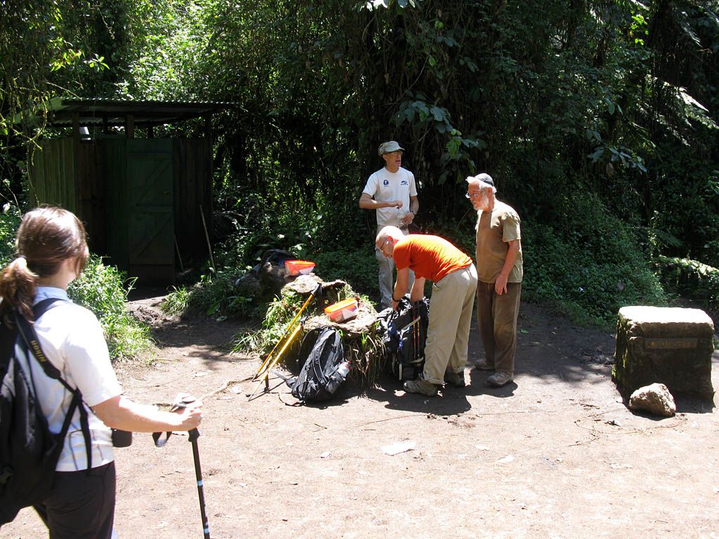I woke up at 5AM and snoozed until 5:45AM when my alarm was scheduled to go off. I watched a beautiful sunrise, had breakfast, checked out and we left our travel (i.e. airplane clothes) bags in a secure place and was ready by 7AM. Having picked up my rentals (a rather thick cosy warm sleeping bag and a rather useless 'face mask' which actually turned out to be a rubbish (and too big) version of my balaclava that I had brought with me), we watched all our gear loaded onto the bus and set off at about 7:30AM. We drove out through Arusha and eventually came off the main road and headed north. After an age driving past countless banana trees we eventually arrived at the Machame gate. We then had a long wait while the porters unloaded our gear, prepared it so they could carry it to the first camp site, and had each sack weighed to ensure regulations were adhered to.