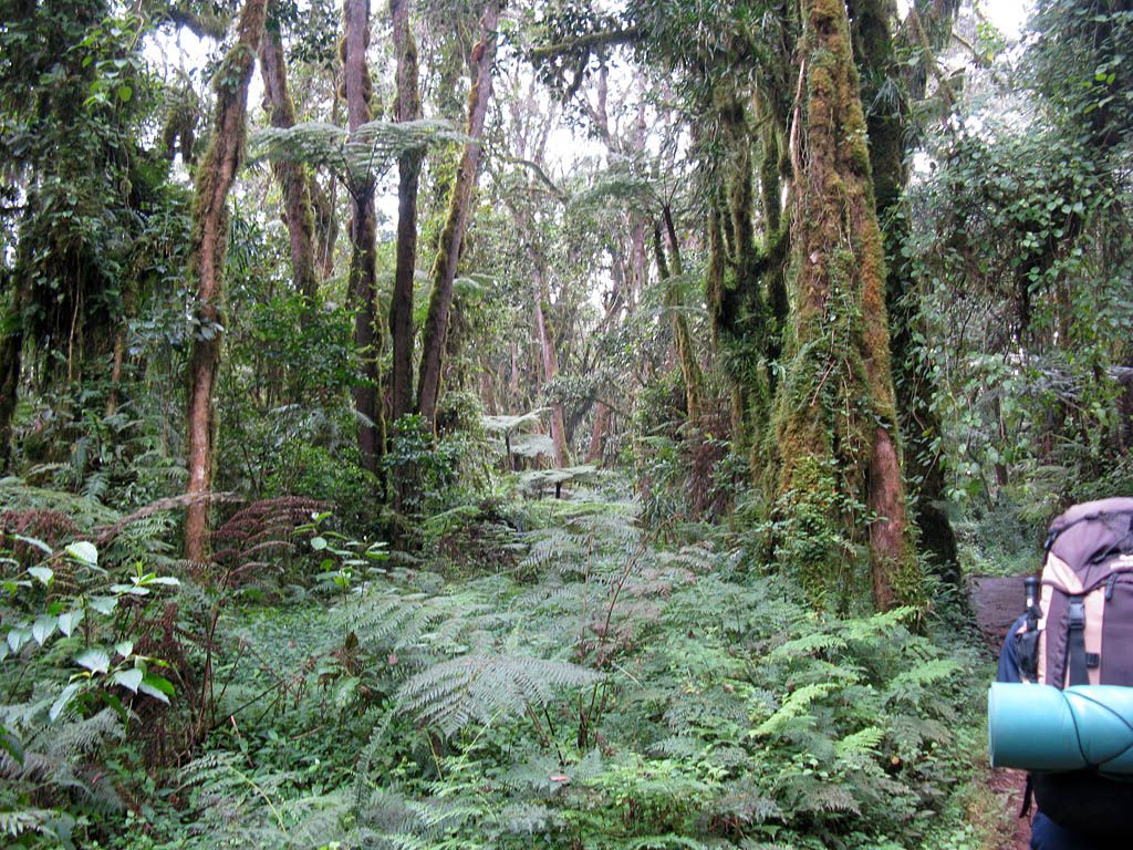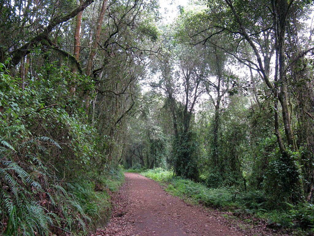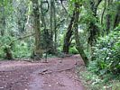 The 4 wheel drive track eventually ends and becomes a well kept footpath. | An Impatiens Kilimanjari flower. | As we get higher the ferns dominate the forest more and more, as does Old Man's Beard, the moss hanging from all the branches. |