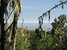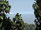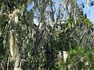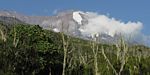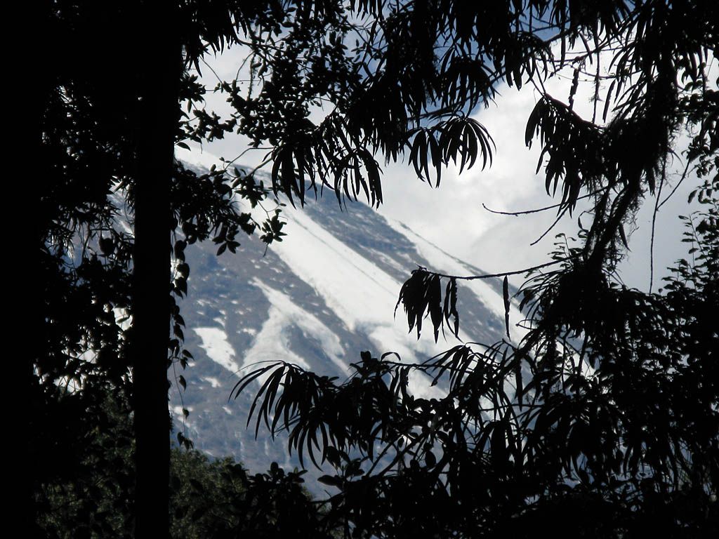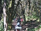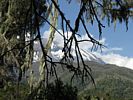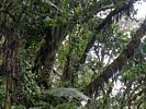 The first view of the summit glaciers through a gap in the trees. | As we get higher the trees thin a bit and Old Man's Beard gets ever more prevalent. | Another view of the summit. | Looking behind as we reach the tree line. We are climbing up through an inversion dividing the murky air below and the crystal clear air above. |