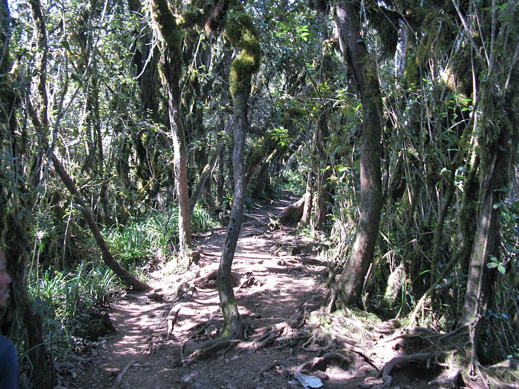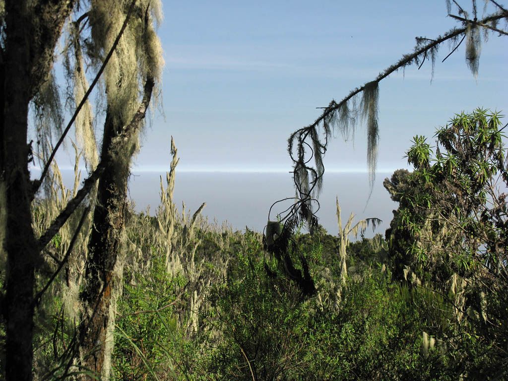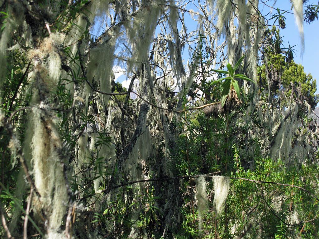 Old man's beard! | Now above the tree line, a panoramic view across the giant heathers towards the summit opens up. |