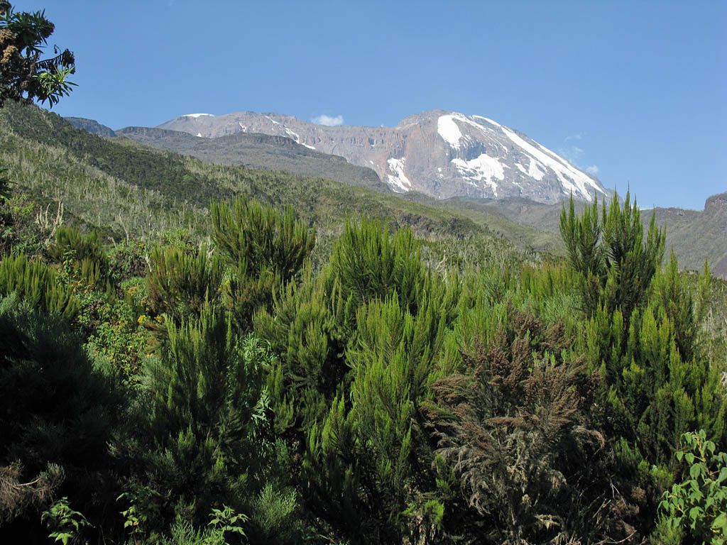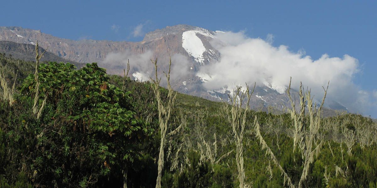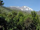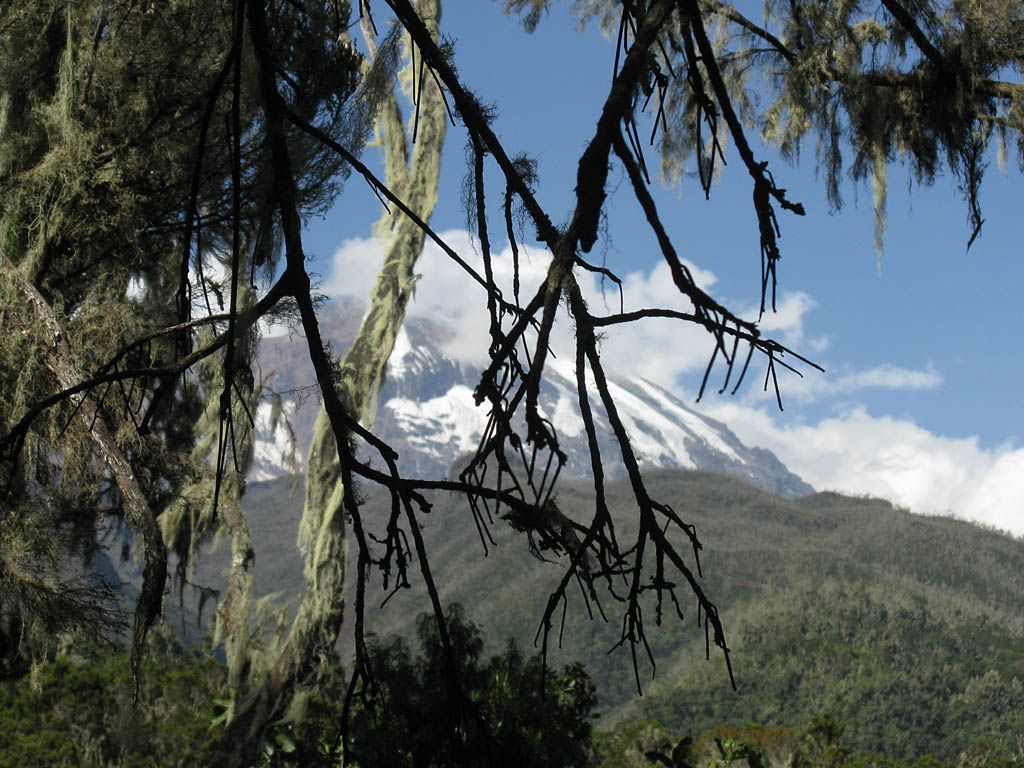 Eventually all the gear and porters were ready, and we set off through the gate and almost relentlessly uphill. The four wheel drive track was pretty nice. That eventually ended and became a simple but well kept path that continued up through the Montane Cloud Forest. We found a nice spot to stop for lunch before we continued upwards on a ridge. As we got higher the trees thinned out a little and we started to get glimpses of Kibo and its glaciers, quite a striking background to the jungle. Meanwhile in the undergrowth there were lots of flowers, including the endemic and beautiful Kilimanjari flower. It was a pretty tiring walk but soon enough we cleared the tree line and the path suddenly opened up into giant heathers and other heath land bushes. Behind us I could see the inversion at about our height or just below with cumulus sitting on it, and in front the view to the summit became a panoramic vista.