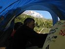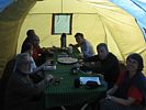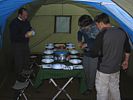 Inside the dining tent. For a popcorn welcome, the view of the summit from within, and setting up for supper. | To the East Mount Meru appears as if it is floating on the haze in the evening twilight. | One last look at camp in the deepening twilight. |