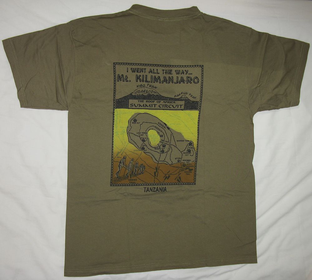 Checking in at Machame hut when we arrive at camp. This is where I bought my Kilimanjaro T-shirt. | The Kilimanjaro T-shirt including a zoom in on the logo on the back. | View of the summit from the camp site. Chef's tent in the middle of the first shot. Black and yellow tents were our sleeping tents. I had one to myself. |