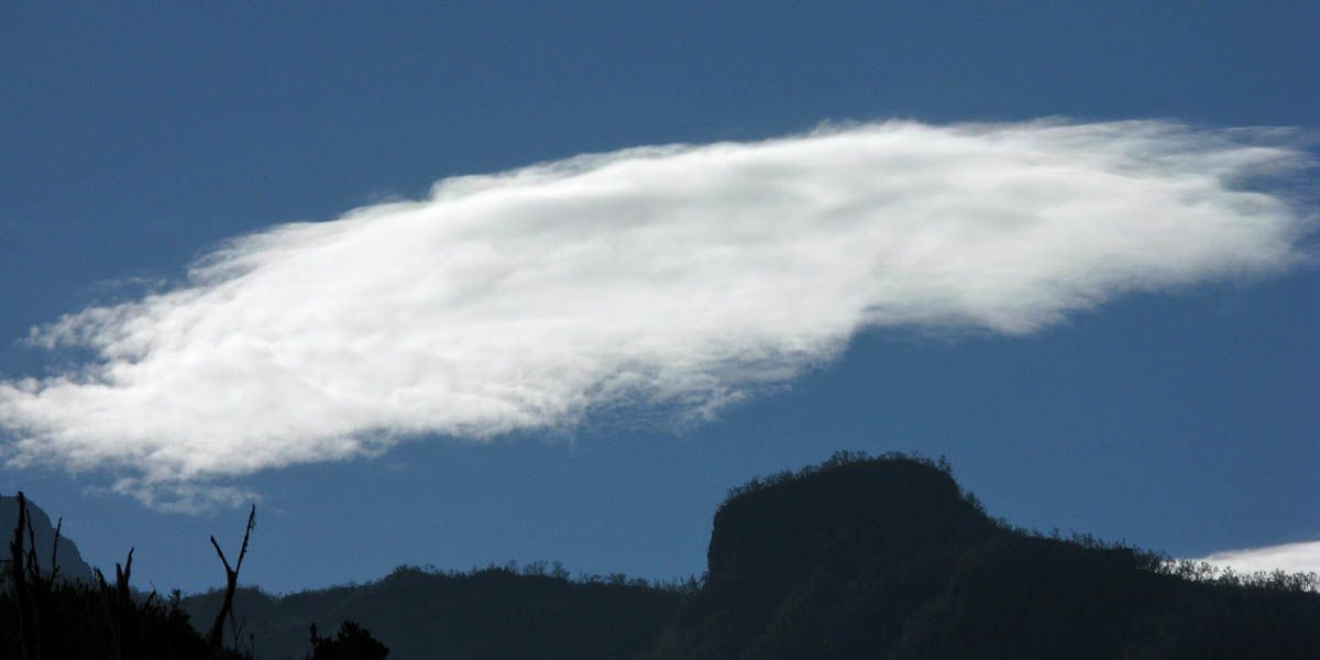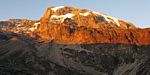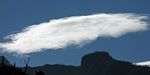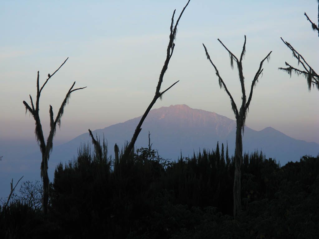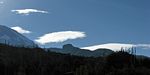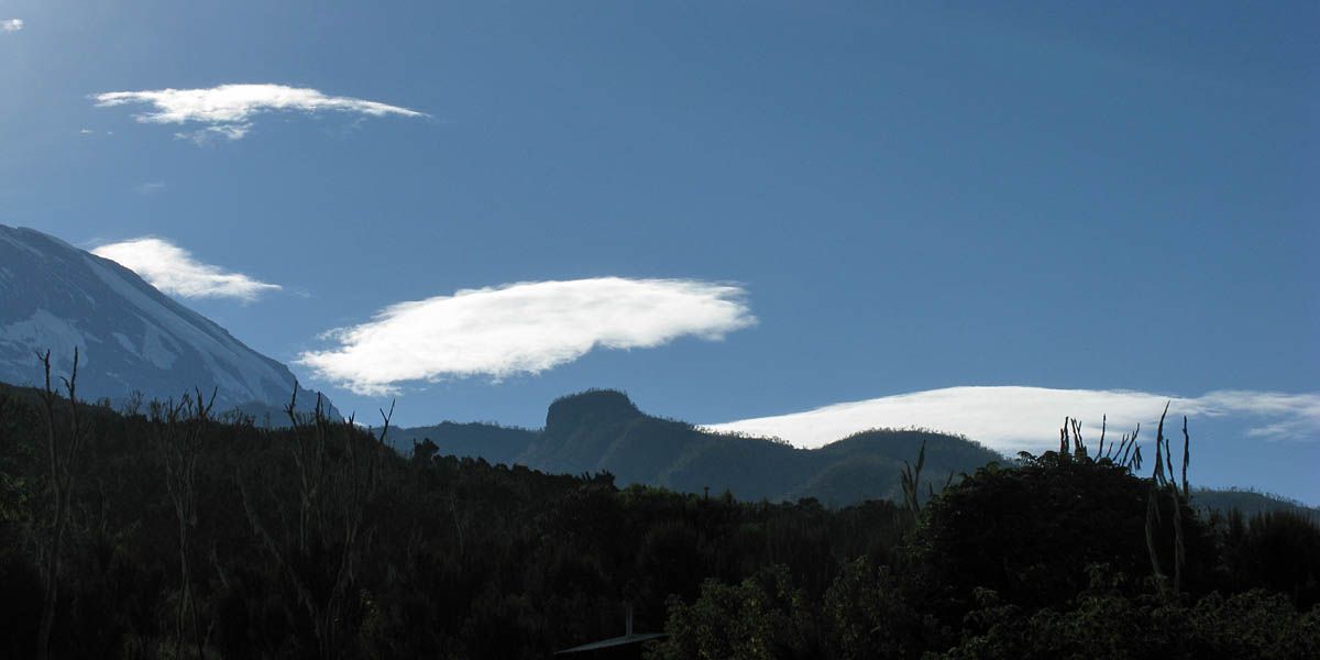 Sunrise at Kilimanjaro. | Despite being at only 3 degrees south, being at almost 10,000 feet (Machame Hut is at 3021m/9911ft) already it is cold enough at night for a ground frost to form. | Mount Meru floating on the haze again at sunrise. | Lenticular clouds forming in the lee of the summit. I guess it's breezy up there. |