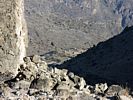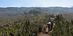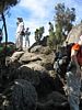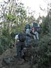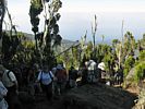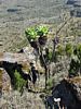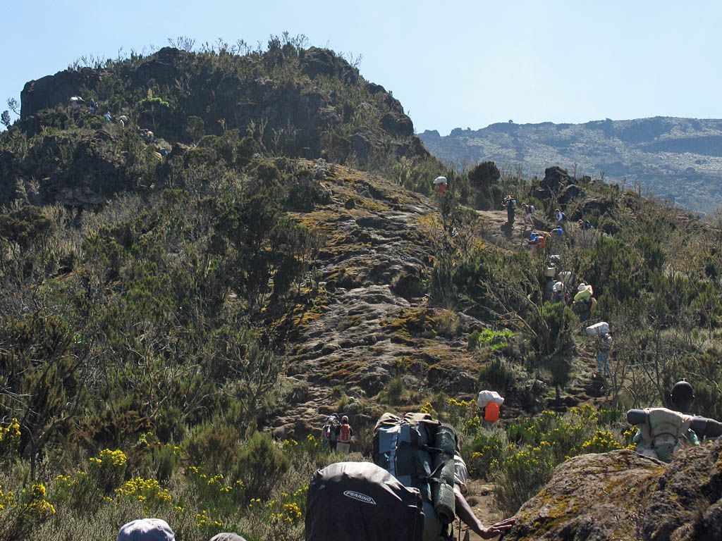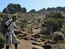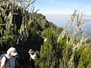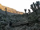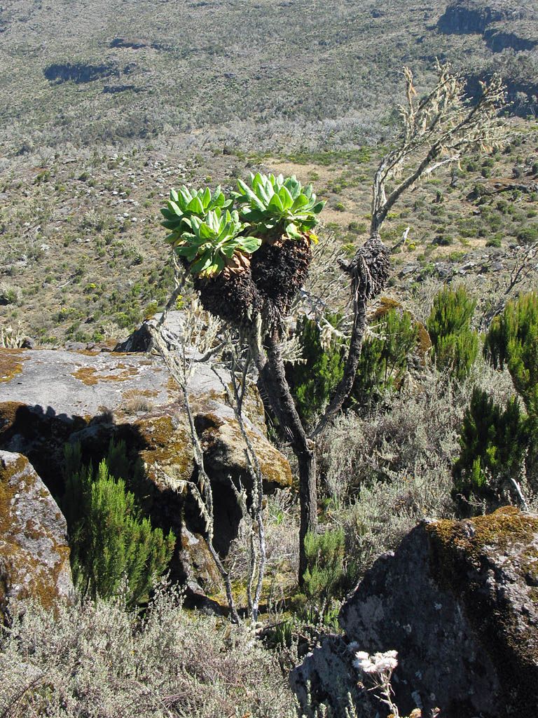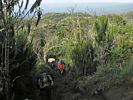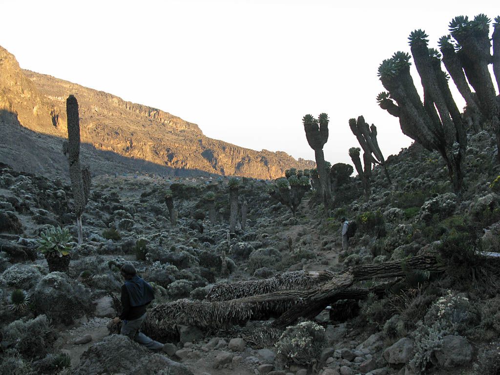 Every time I look back the view gets more and more stunning. Especially with Mount Meru 'floating' on the haze. | Going up and around some huge boulders. | Passing some resting porters. | This shows the ridge that we have been climbing up well. | The first Tree Groundsel plants as we get to the height at which they grow. |