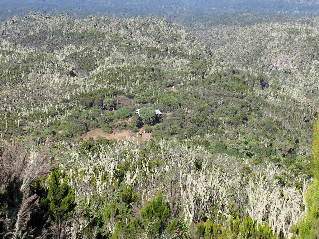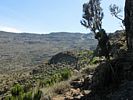Climbing up a steep slope away from Machame camp through the giant heathers, enjoying the ever more awe inspiring views as we get higher. | Looking up at the Shira Plateau still towering above us. | Machame camp is now a long way below us and getting ever smaller. |