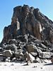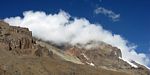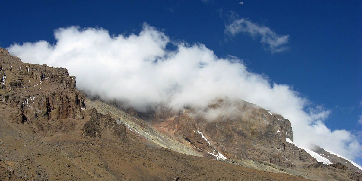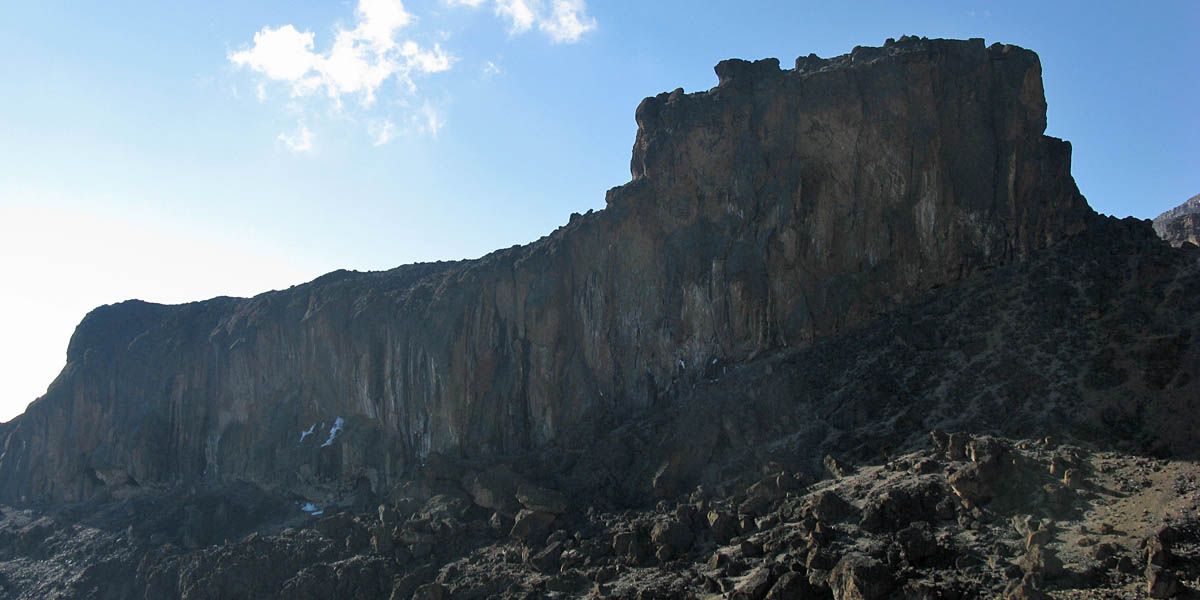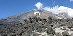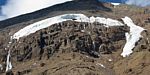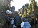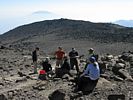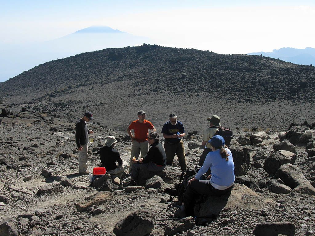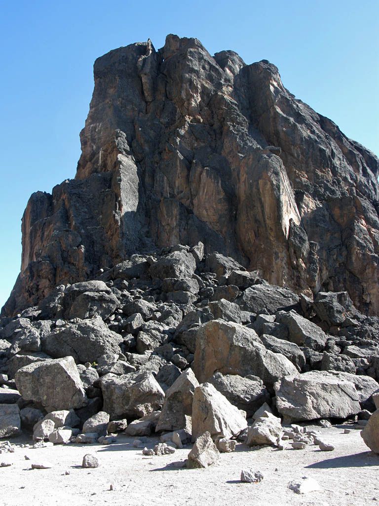 Lava Tower from the base, also known as Lava Tower camp. We are now at 4627m/15,180ft. | Kibo's cloud hat evolving above us. | Looking up the Western Breach route from its start point. | Group shot at the base of Lava Tower. From left to right: David, Bob, Anne, Misha, Susan, Yedidya, Boaz, Mike |