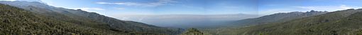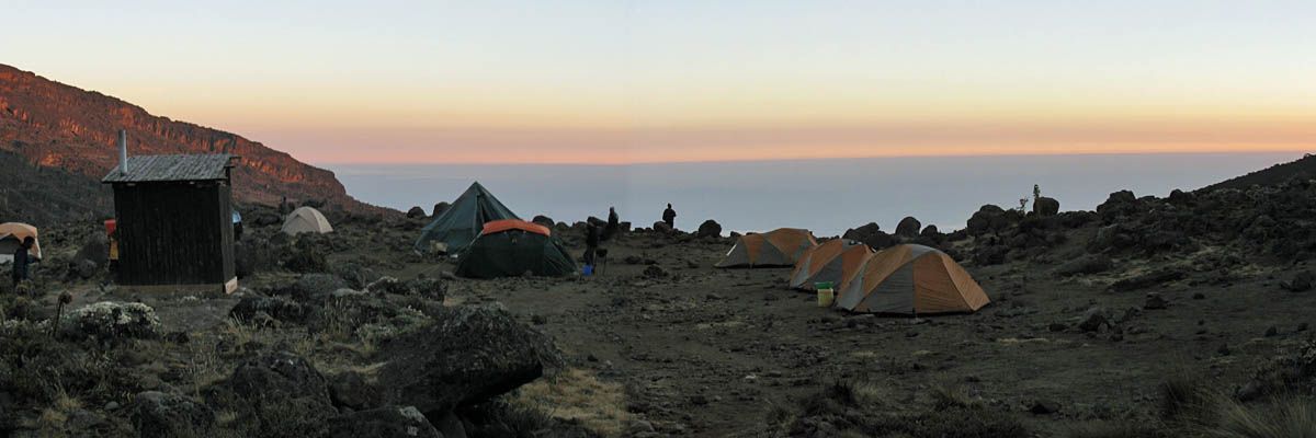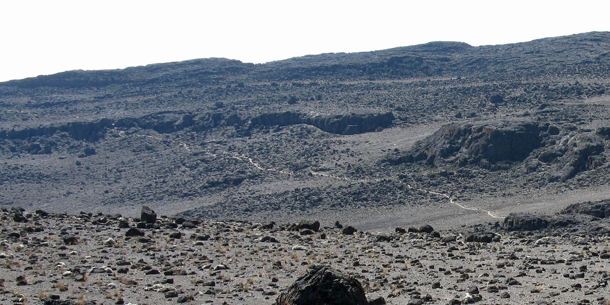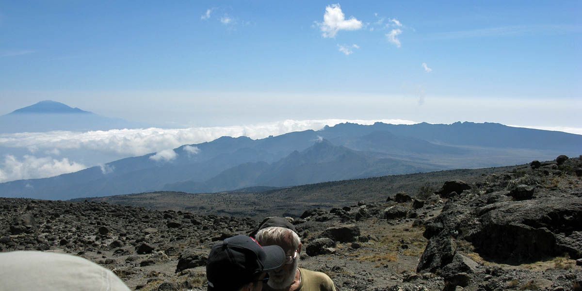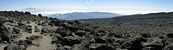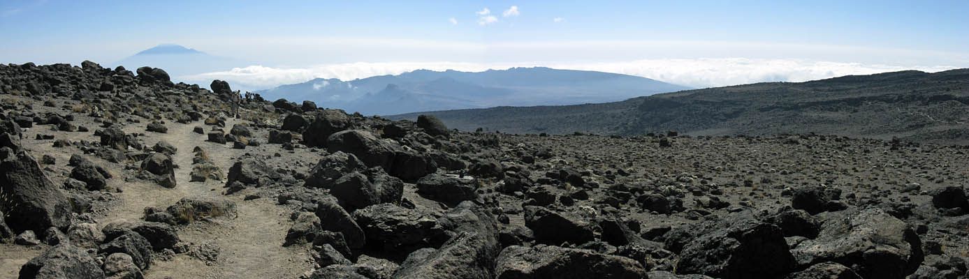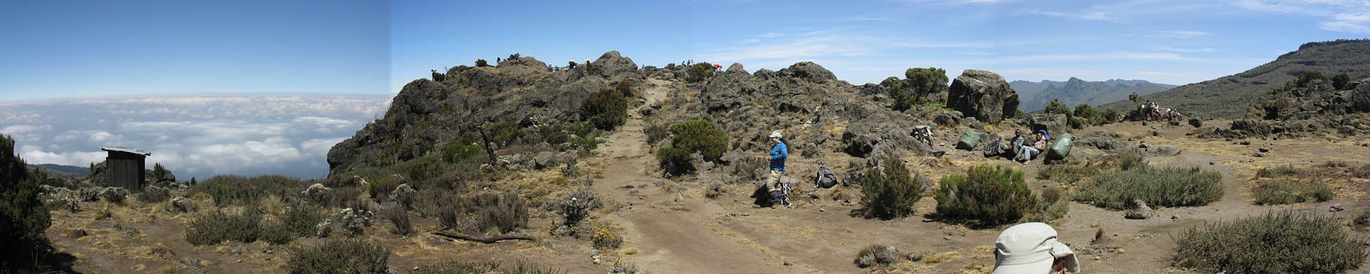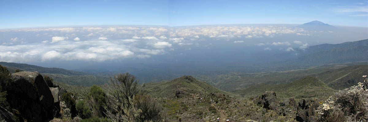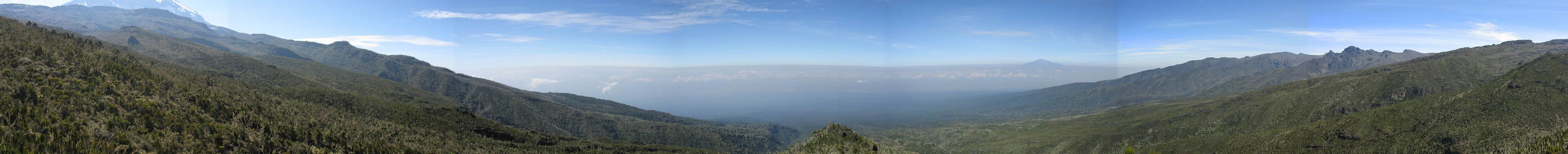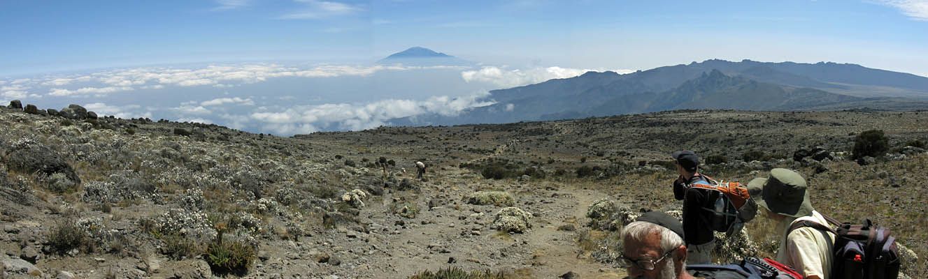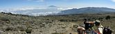 Onwards and upwards we go! | A spectacular panorama from summit (left) to Shira Plateau (right) looking down the way we came. Taken from a lookout point. |