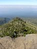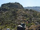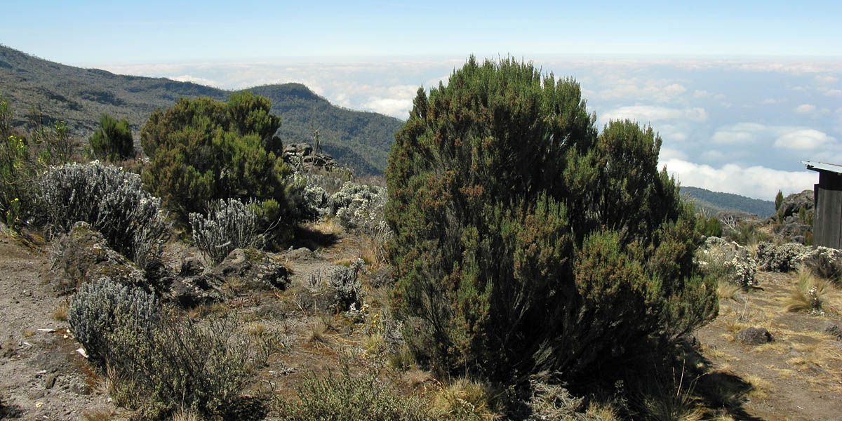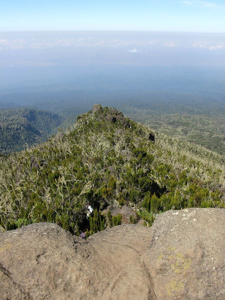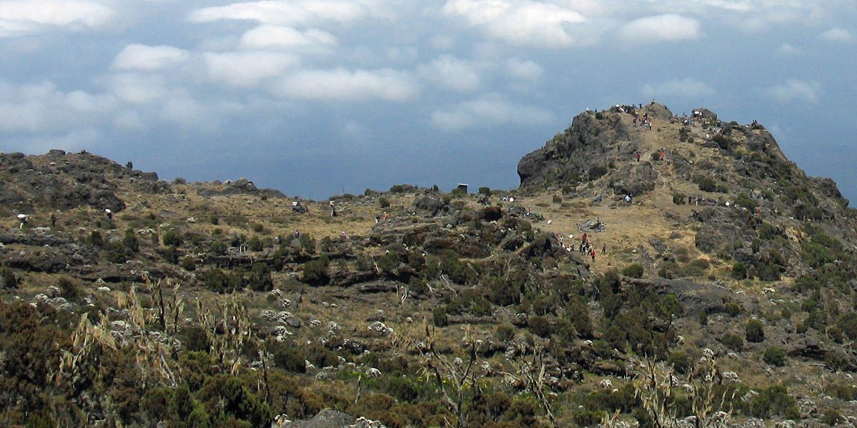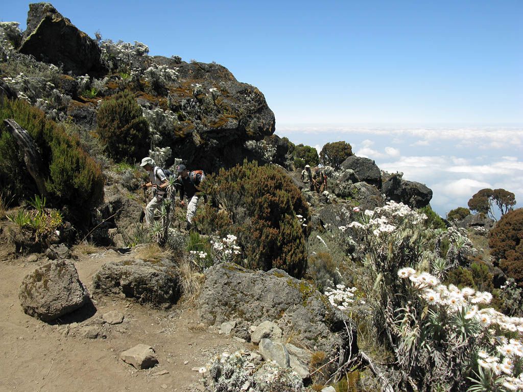 Pictures taken from the lookout point, a pile of boulders allowing us to get above the giant heathers. Looking down the way we came, to the summit, down to the bottom of the boulders and across to cumulus clouds forming below us. | Looking up at the lookout point from the path below. | Continuing on as the path gradient levels out as we get close to the height of the Shira Plateau. |