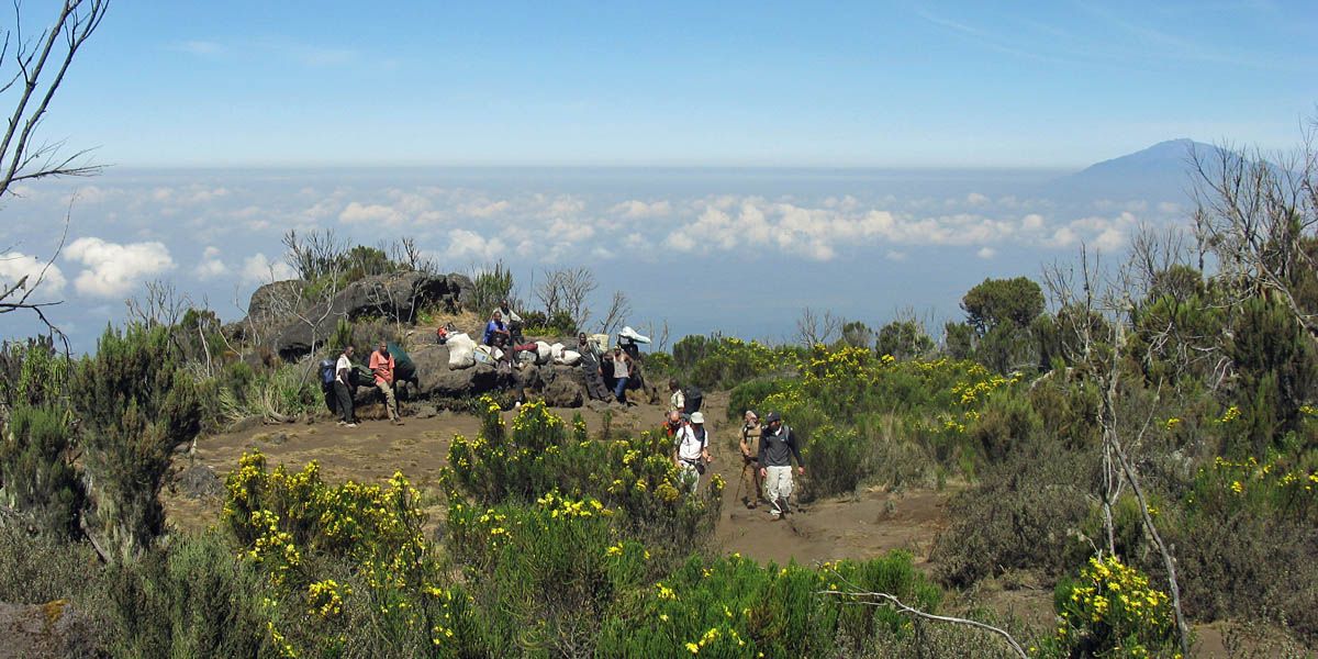 Looking back at the rest stop as we carry on up to the lunch stop. | Onwards and upwards. The everlastings getting more and more common as we get higher. | Here is where we stopped for lunch, just above the Shira Caves. How's that for a spectacular lunch view? |