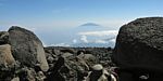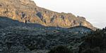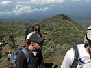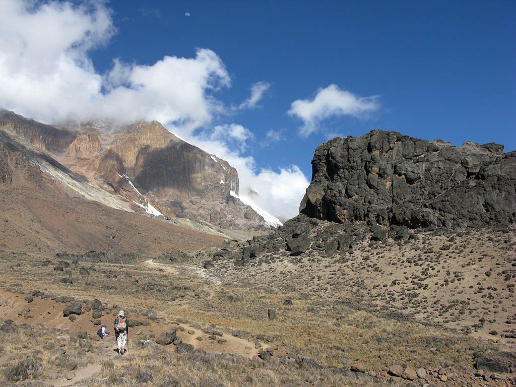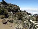 From the lunch stop there was a 'prohibited path'. Yep we went that way. A shortcut bypassing Shira Caves and saving time and distance. | Now above the Shira plateau and getting high up, the gradient is now more gentle, the vegetation more sparse, the air much thinner, and the views ever more spectacular again as the Shira Plateau joins Meru floating on the haze and cumulus clouds below. | Looking ahead past spectacular towers of lava boulders towards the glacier and cloud shod summit. |