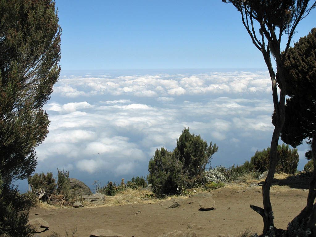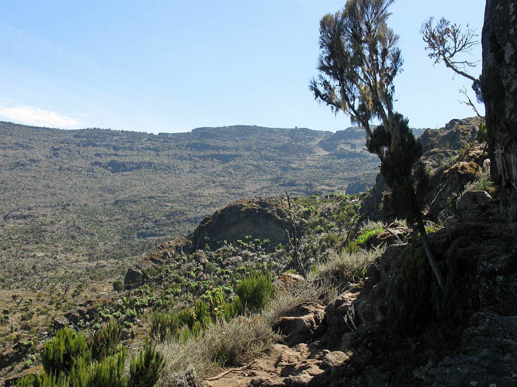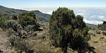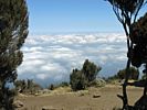 We set off from Machame Camp at 8:30AM. From the outset it was a steep relentless climb uphill through the giant heathers. The higher we got the better the panoramic vista behind us got, especially as cumulus clouds started to bubble up below us across the plain. A fair way up we passed a big pile of boulders that served well as a breathtaking lookout point. Higher up we found our first Tree Groundsel plants. Then not far short of Shira Caves we had a respite from the climb as we reached a small plateau where we had a rest stop. Around here the first Everlastings appeared too - some small flowers that, after dying, remain intact as a dried dessicated ghost of a flower. All the while the imposing Shira Plateau, a big wall of rock above us, got ever closer.