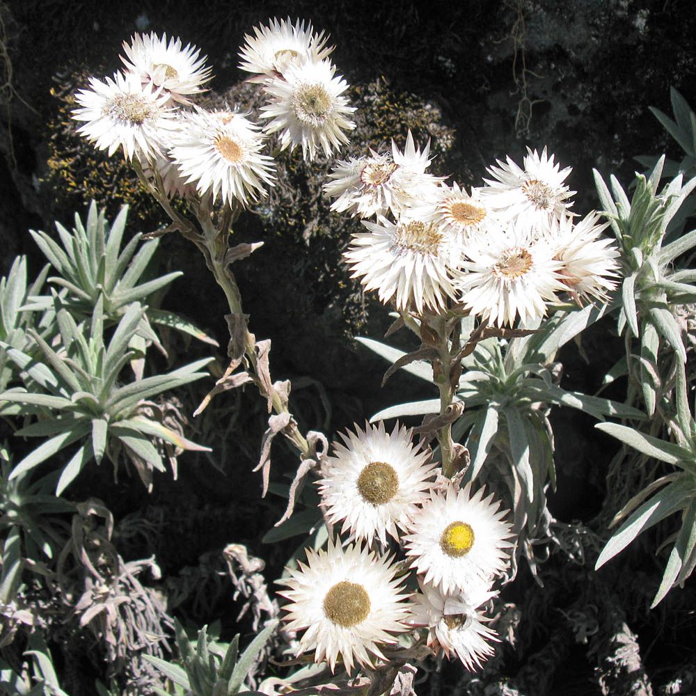 The path ahead marked by porters. Our guide leading the way. | The panoramic views continue to get ever more breathtaking as we take a break not far now from the lunch stop above Shira Caves. | The first everlastings. These flowers are only found at high altitude. |