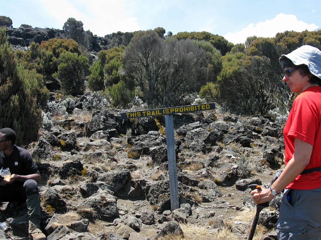 I felt a little better after the lunch rest thankfully. I was put at the front of the group to set the pace. From the lunch stop was a sign stating that 'This Trail is Prohibited'! It was actually a path that cut a corner. So instead of a 15 minute trek down to Shira Caves and then back up again we cut across above Shira Huts and reached the path to Lava Tower much more quickly. This was a gently inclining path thankfully as I was feeling a bit rough. We took it slowly and steadily uphill, leaving behind the giant heathers and eventually many of the Everlastings too, as we climbed high up into the field of large lava boulders that were strewn everywhere. On the way I experimented with my breathing, and discovered that slower deeper breathing helped a lot and the headache all but disappeared. (I guess the deeper breath puts higher pressure in the lungs allowing more oxygen to be absorbed. Great!) The only downside was that heavy breathing the cold high air altitude air chilled my lungs a bit, and they felt funny for the rest of the day with a slight chesty cough developing too. (Fortunately after a good night's sleep they returned to normal so not to worry.)