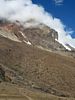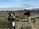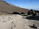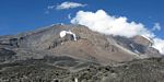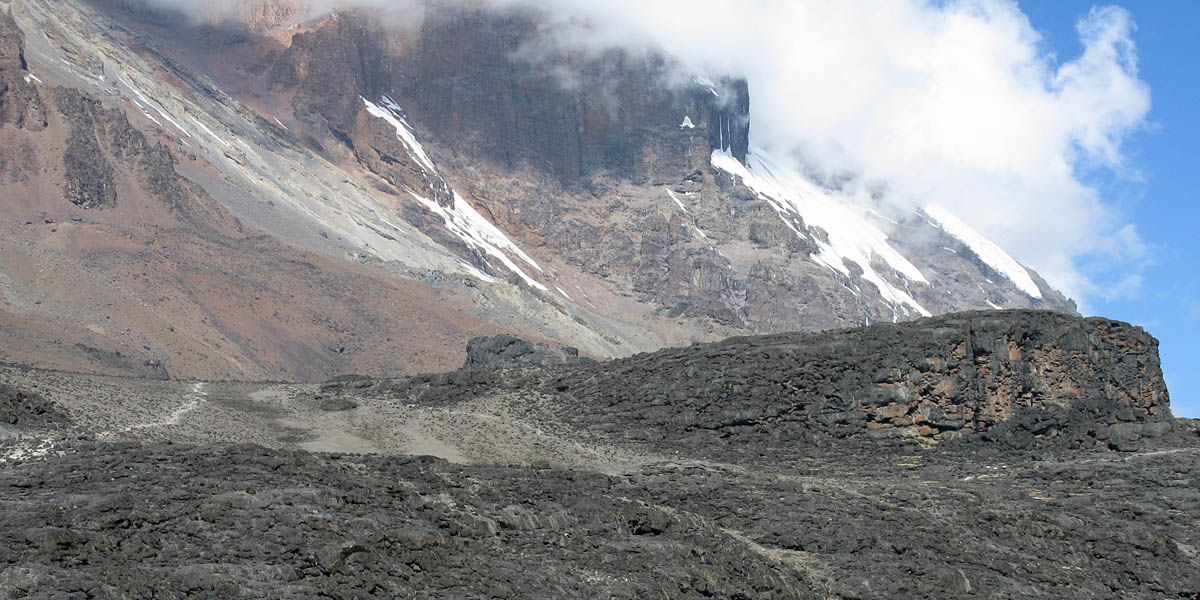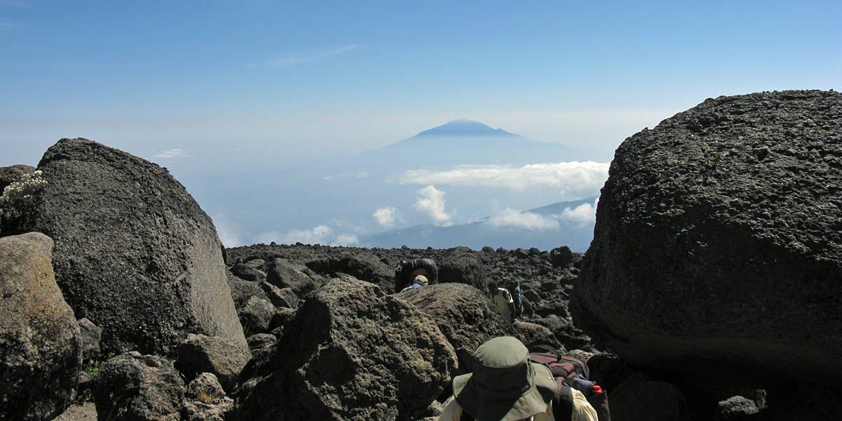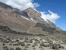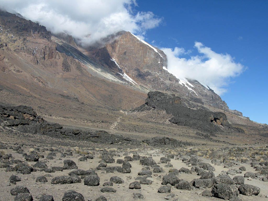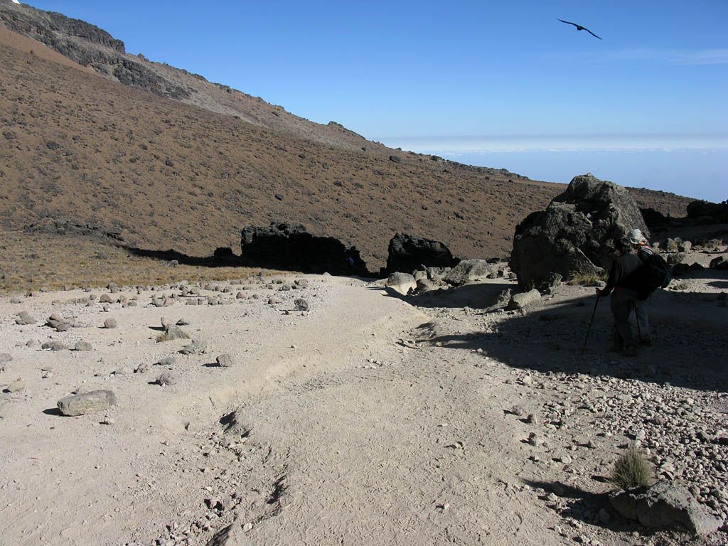 Higher and higher... Mount Meru and the Shira Plateau still appearing to float on the haze and lower clouds. | Nearly at the base of Kibo itself, which is sporting a nice cloud hat. | Converging with the path from the Shira Plateau / Lemosho route as we get close to Lava Tower. | Walking close to the base of Kibo. |