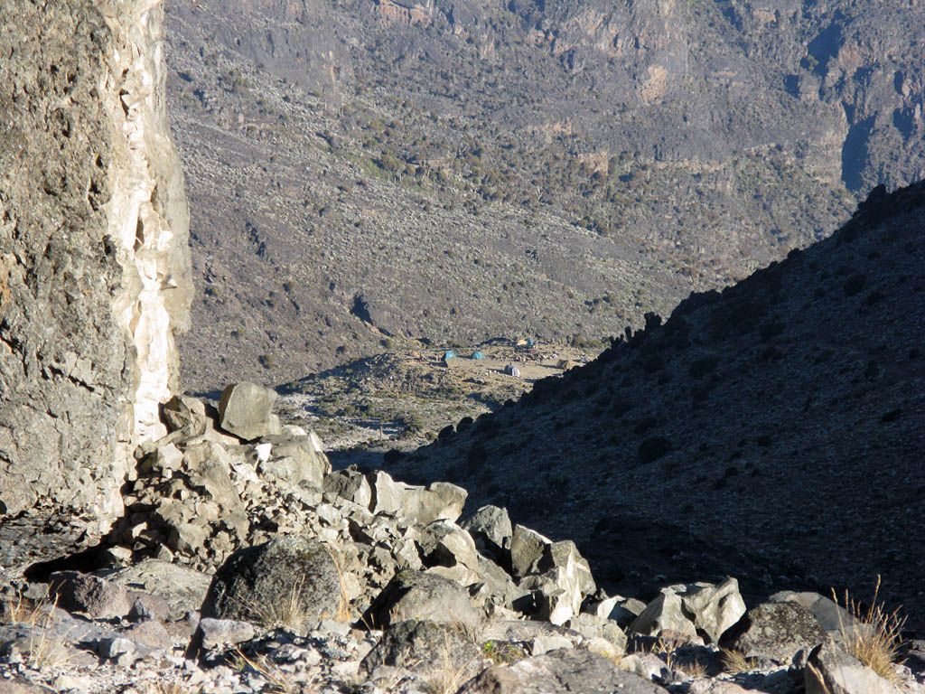 After our stop at the Lava Tower Campsite, we started to descend to Barranco. However this descent was rocky and tough, and my lungs had started to feel a bit funny from the cold. Some of my toes were starting to hurt from all the jarring of the rocky descent too. Despite this I was still enjoying the spectacular scenery. However after having walked many miles over many hours at high altitude, I was just itching to get to Barranco Camp and collapse in a heap somewhere. We descended into the Barranco Valley, which was grand and spectacular, now right below Kibo. We passed lots of strange and wonderful Tree Groundsel plants, a sure sign that we were lower now. Meanwhile up ahead we could start to see the camp site in the distance in the valley. On the way down we were in shadow, but the golden hour sun lit up Kibo in the most wonderful light as the day got late. After an age of descending slowly and painfully over tortuous rocks, I finally hobbled my way into Barranco Camp just as the sun set! How's that for timing!