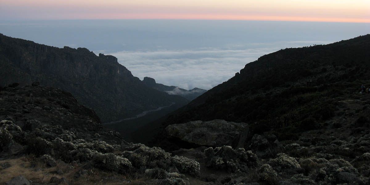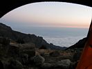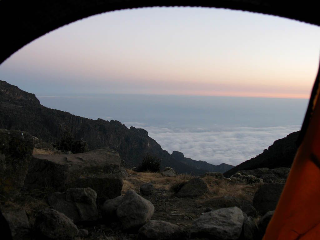 Now in the campI was shown to my tent with a view down to the plains maybe 10,000 feet below. I rested for a while feeling rather worn out, now well wrapped up against the increasing cold. A migraine kicked in from the stress of such a long and strenuous day. But that was soon squashed with some tablets I had for just such an occasion. I managed to get some nice twilight photos from my tent before it got too dark. Looking down the valley onto the clouds below was pretty epic. Supper was served after a while which was vegetable soup and spaghetti with vegetable sauce, and was delicious. After supper and the briefing for the next day I went straight back to the tent for a much needed sleep, and was out like a light!