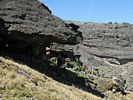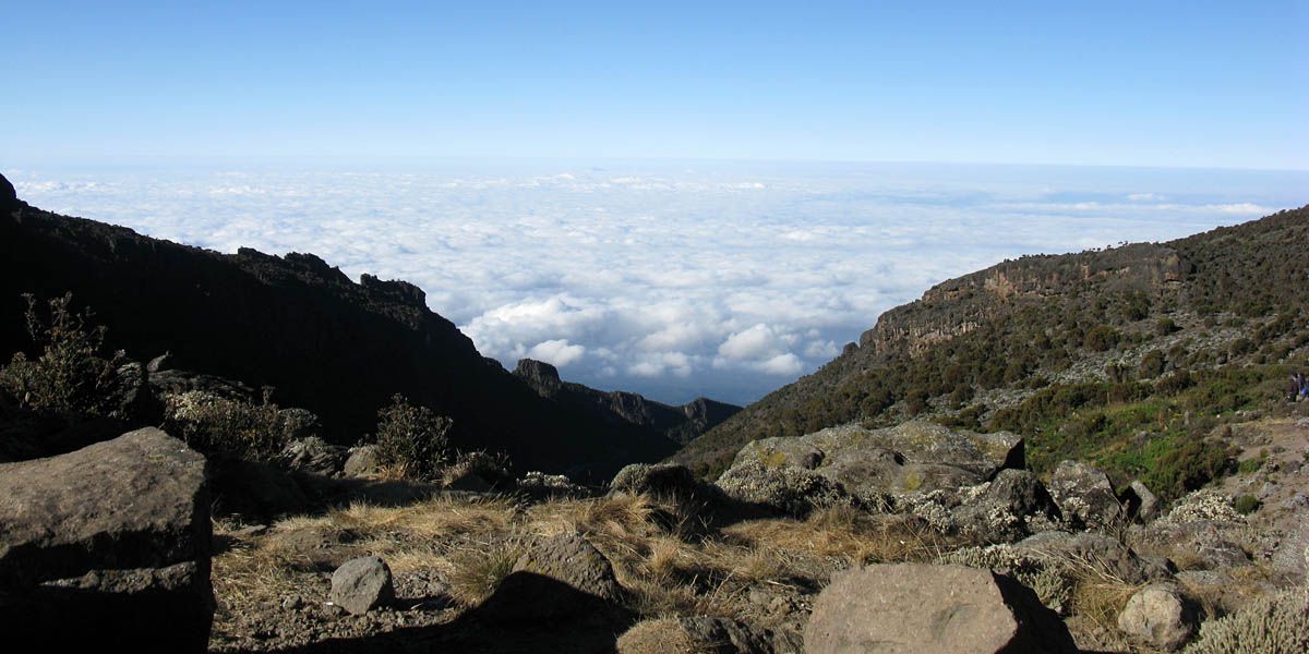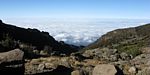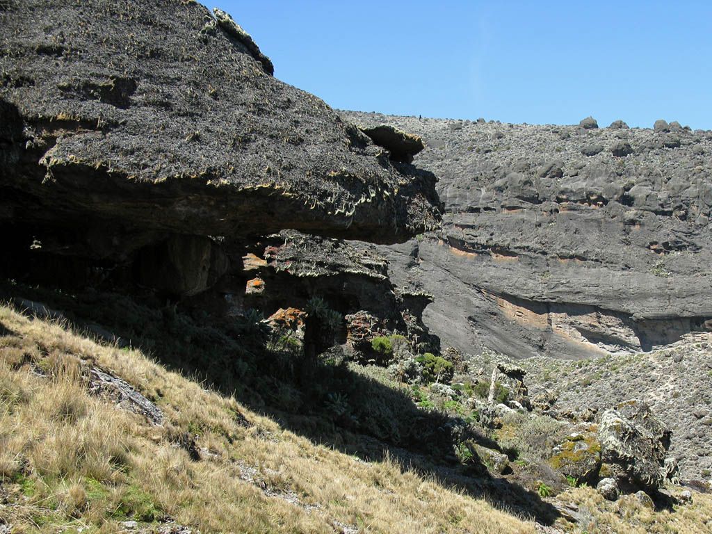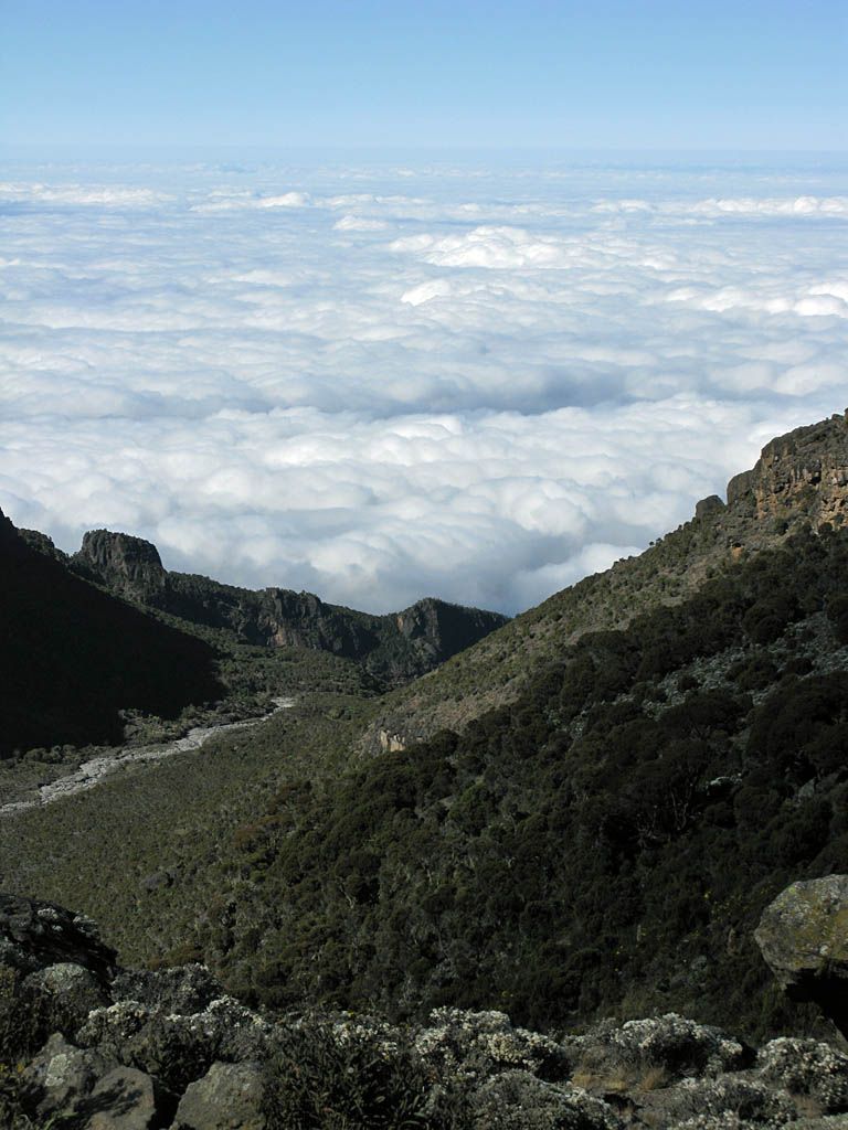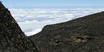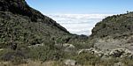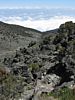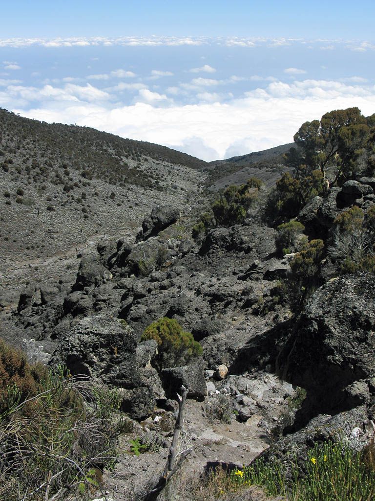A nice rocky overhang. | Spying the valley floor below. | Looking up to Kibo and down towards the clouds from the valley floor, and ahead to the path up to Karanga Camp above. | Looking down at gathering cloud forest rainclouds as we near the top of the camp side of the valley. |