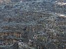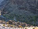 A stunning view down the Barranco valley early in the morning. | Barranco camp complete with Tree Groundsels in the middle. | The Barranco wall busy with early morning porters and walkers, and a Groundsel forest below. I'm glad we waited until after the early morning rush hour had died down. |