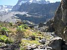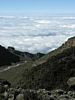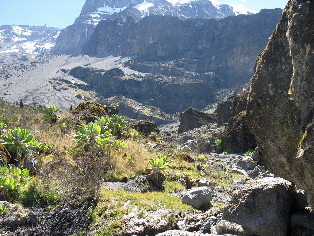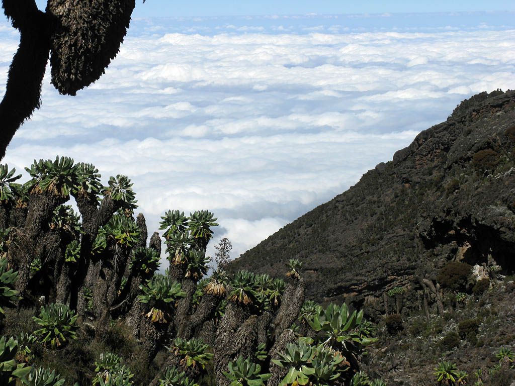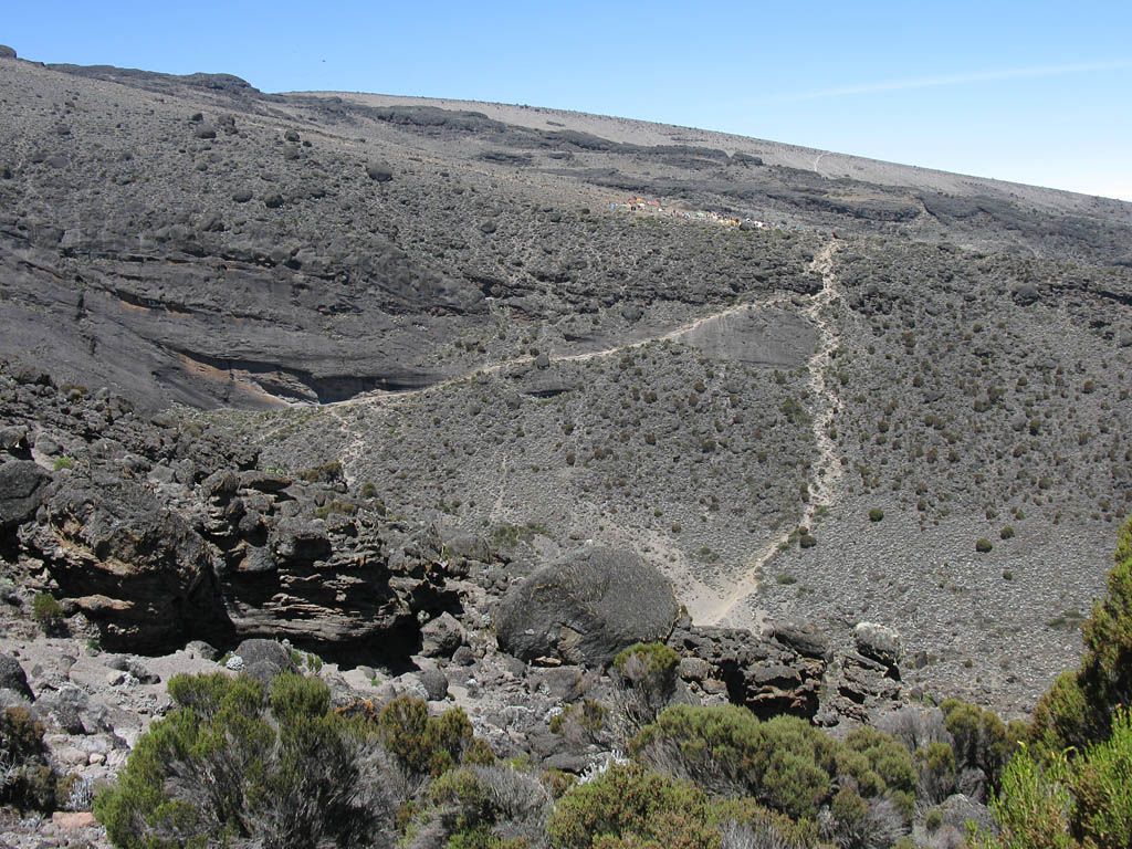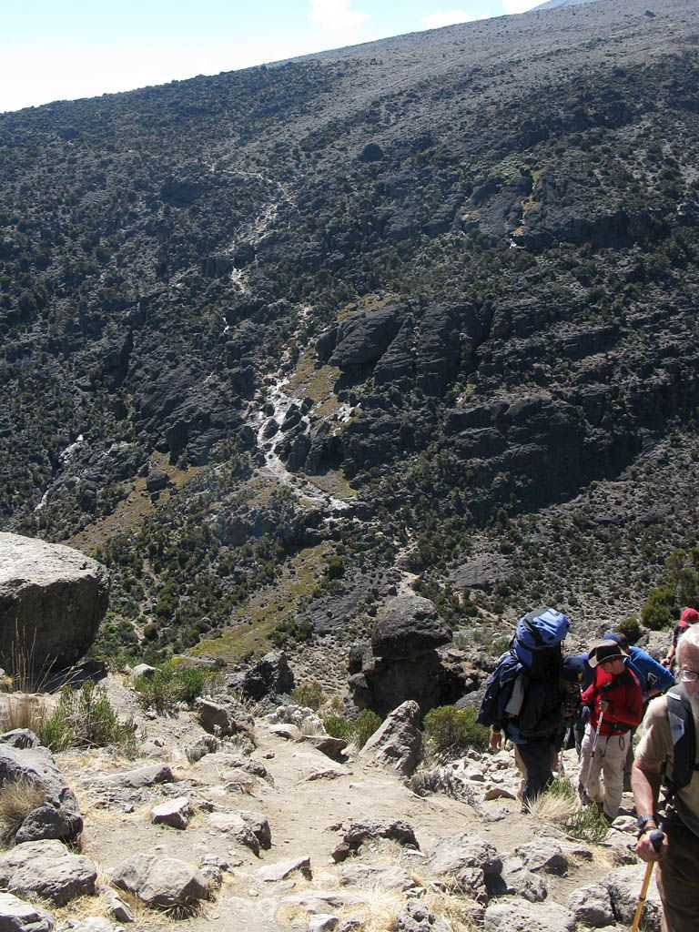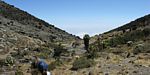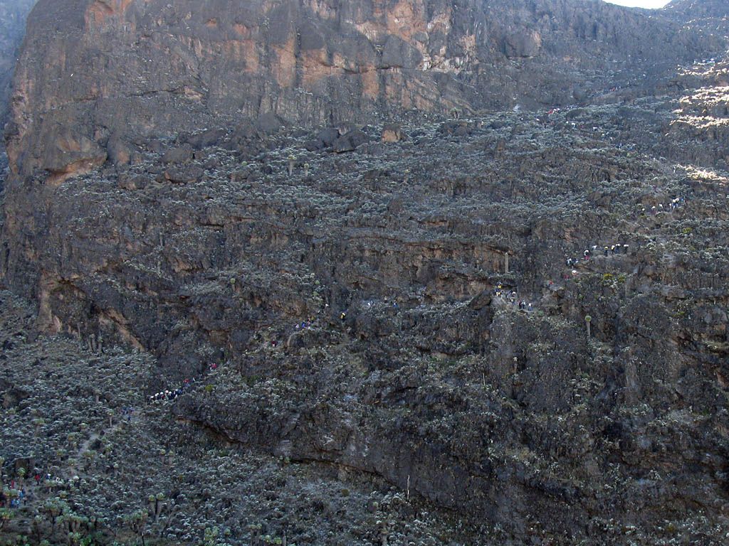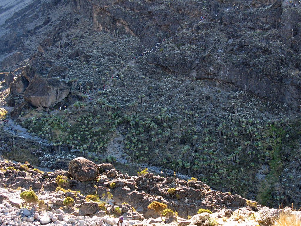 I woke up to the usual noise of other campers, porters and guides packing up and getting ready to move on. I was feeling rather rough still but we weren't setting off until later on as we only has a few miles to go to Karanga. A refreshingly short day after yesterday's 9 hour epic. In the early morning daylight the views down the Barranco Valley to the clouds way below and up to Kibo were stunning as ever. I noted that there were Tree Groundsels growing within the camp and a whole forest of them just below us between the camp and the Barranco Wall. On the wall there was a massive log jam of porters and climbers, in the shade. I'm glad we were waiting until they all cleared off. Meanwhile the tropical sun was rapidly warming the camp site up. So breakfast was at 9:30AM and we were due to set off at 11AM. However by 10:30AM we were all raring to go, and the wall had cleared, so we set off half an hour early.