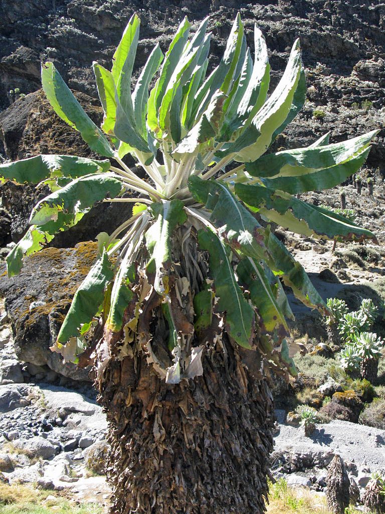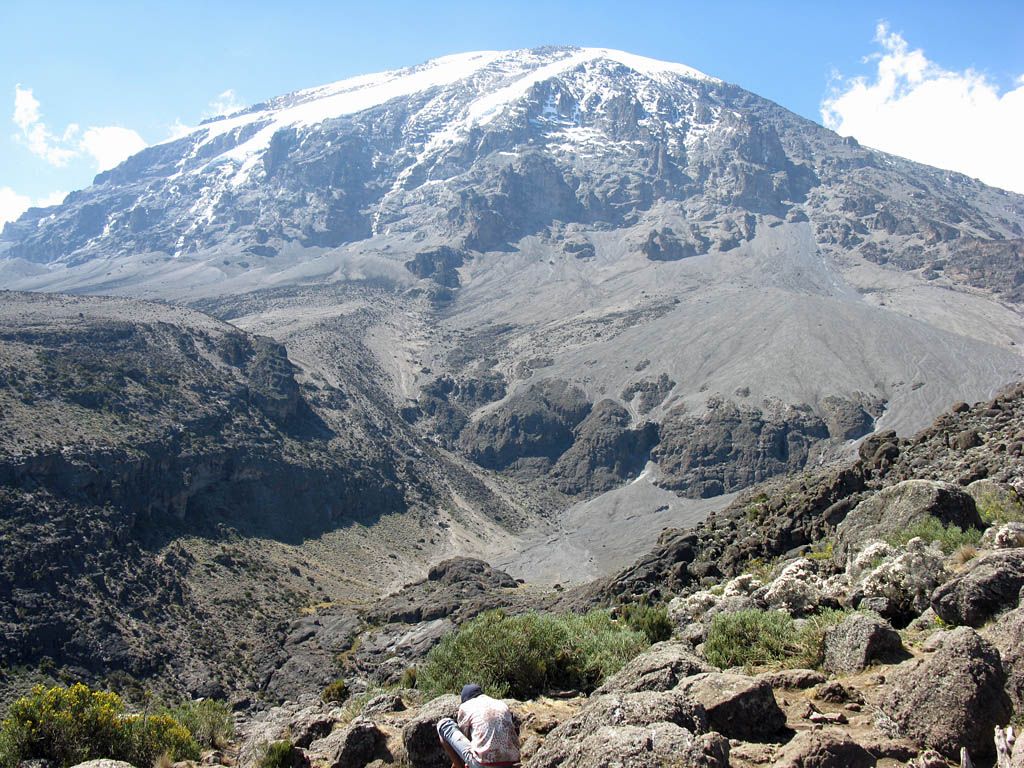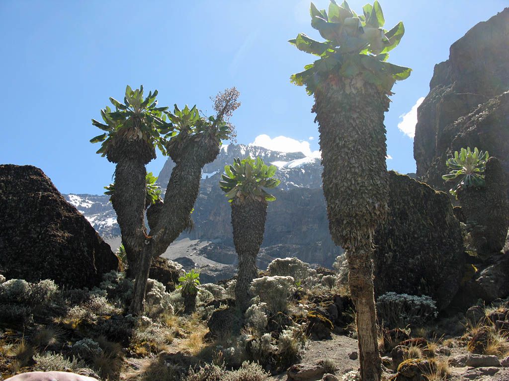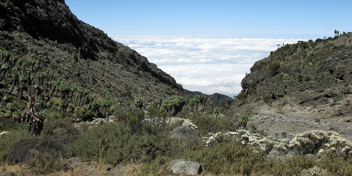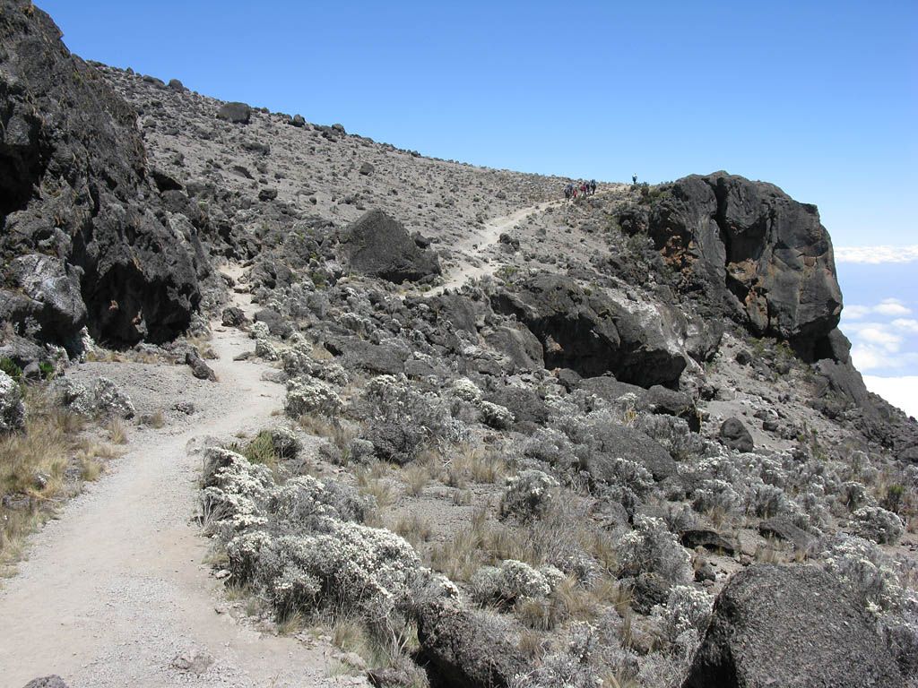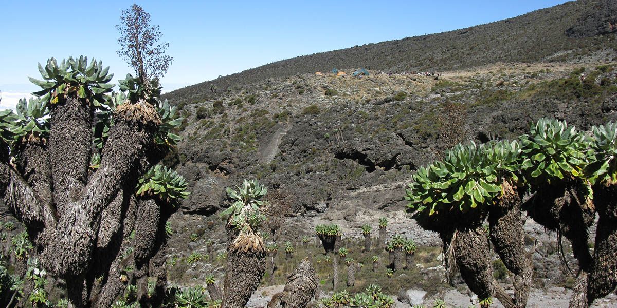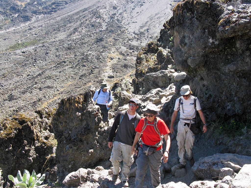 I woke up to the usual noise of other campers, porters and guides packing up and getting ready to move on. I was feeling rather rough still but we weren't setting off until later on as we only has a few miles to go to Karanga. A refreshingly short day after yesterday's 9 hour epic. In the early morning daylight the views down the Barranco Valley to the clouds way below and up to Kibo were stunning as ever. I noted that there were Tree Groundsels growing within the camp and a whole forest of them just below us between the camp and the Barranco Wall. On the wall there was a massive log jam of porters and climbers, in the shade. I'm glad we were waiting until they all cleared off. Meanwhile the tropical sun was rapidly warming the camp site up. So breakfast was at 9:30AM and we were due to set off at 11AM. However by 10:30AM we were all raring to go, and the wall had cleared, so we set off half an hour early.