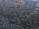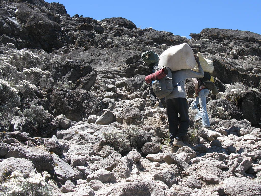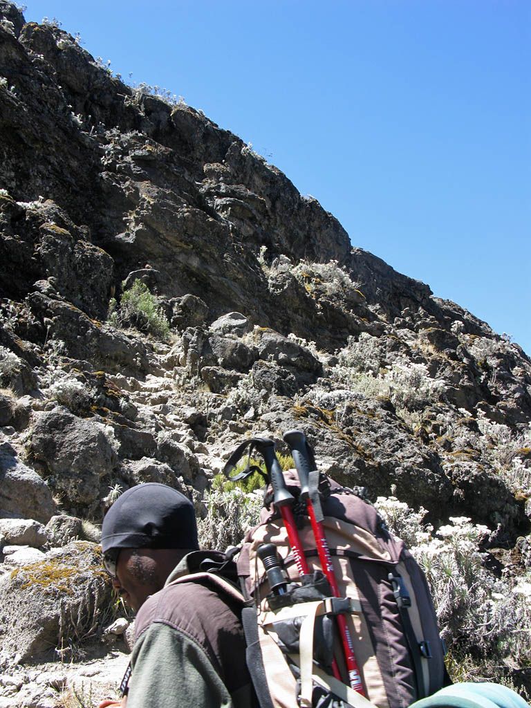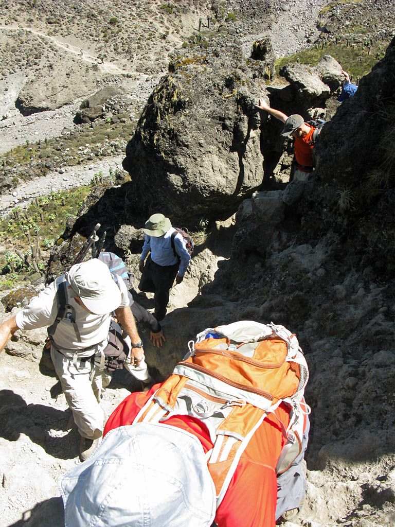 I was still feeling rough as we set off so took it gingerly as we descended from Barranco Camp, crossed a couple of streams then ascended up through the spectacular Tree Groundsel forest to the bottom of the Barranco Wall. By now the forest and the wall were getting into sun. At the base of the wall we stowed our hiking sticks as from this point we needed our hands for scrambling. As we started to climb the wall adrenaline kicked in and I started to feel much much better! I really enjoyed the climb up the wall. I was again at the front of the group directly behind Israel, the guide. This meant that we frequently paused for the rest of the group to catch up after each short scramble stint. I used these pauses to take plenty of pictures. The higher we got the more spectacular the views got as ever, with aerial views across the Barranco valley to the camp, down to the clouds far below, and up to Kibo itself. Meanwhile those amazing porters that romp their way easily over the landscape seemed to make light work of the Barranco Wall, even with heavy loads on their backs. We periodically stopped to let them past. Higher up the wall there were several occasions where I thought we were close to the top. However we rounded the part of the path to the next hidden bit to reveal a small plateau or flat bit with another climb beyond. But we finally reached the top in time for lunch.