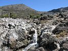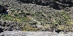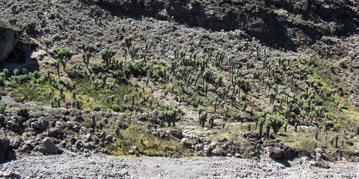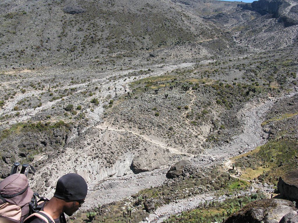 Looking up and down the Barranco Valley as we descend from the camp to the Groundsel Forest and base of the wall. | Crossing streams in the Barranco Valley. | Approaching the Groundsel forest, which is now in sunshine. |