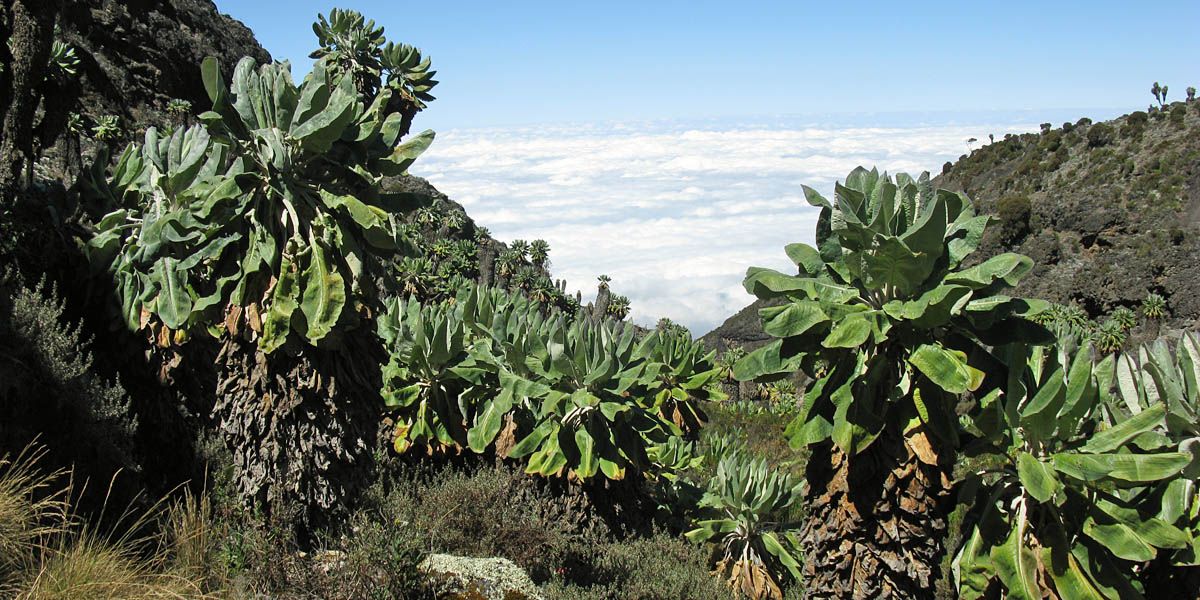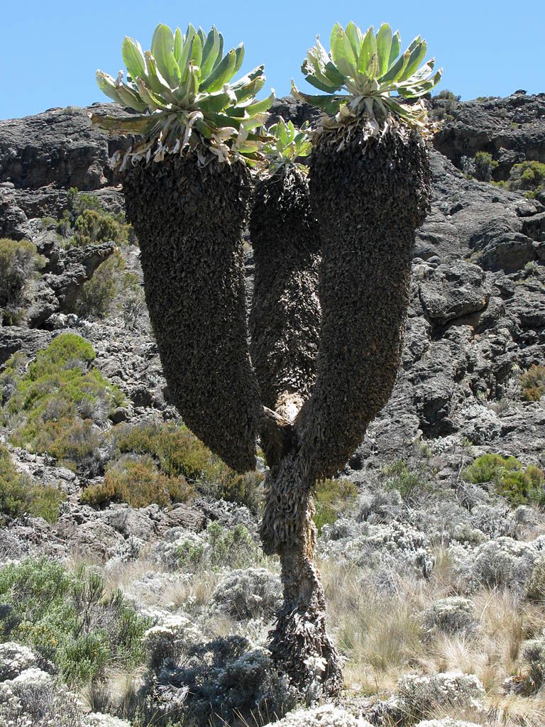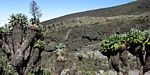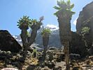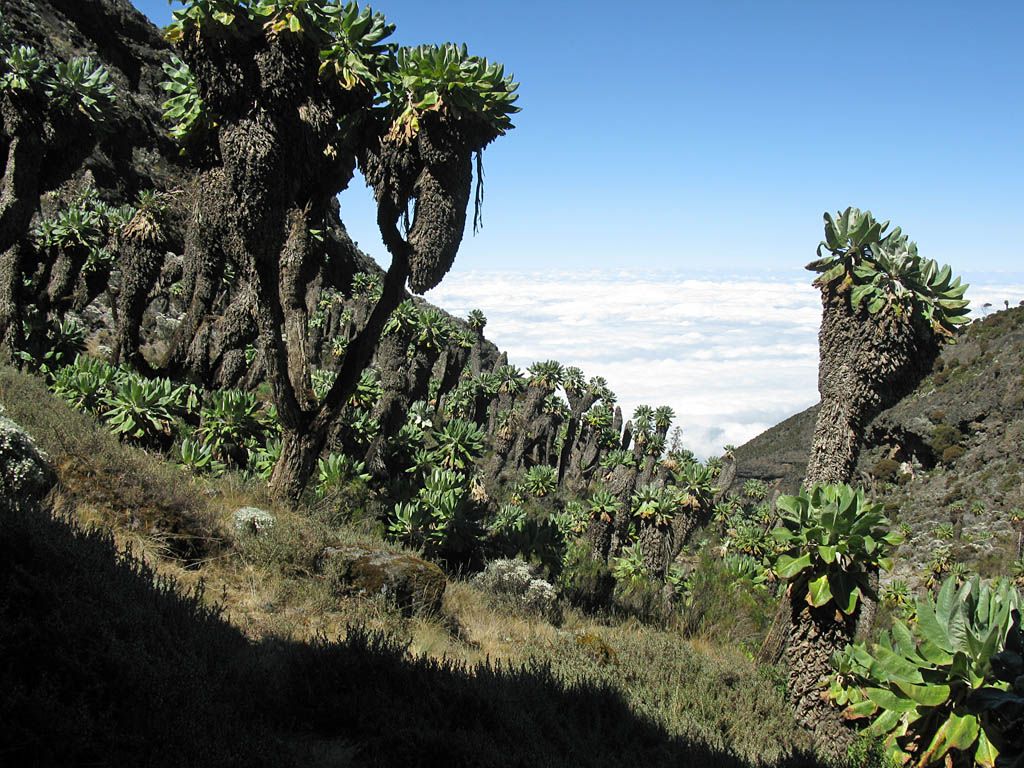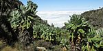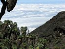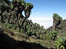 Tree Grounsel. | Alpine Chat bird. | Looking towards Kibo from the edge of the Groundsel forest. | Views through the Groundsel forest down the valley towards the clouds below. |