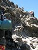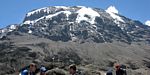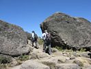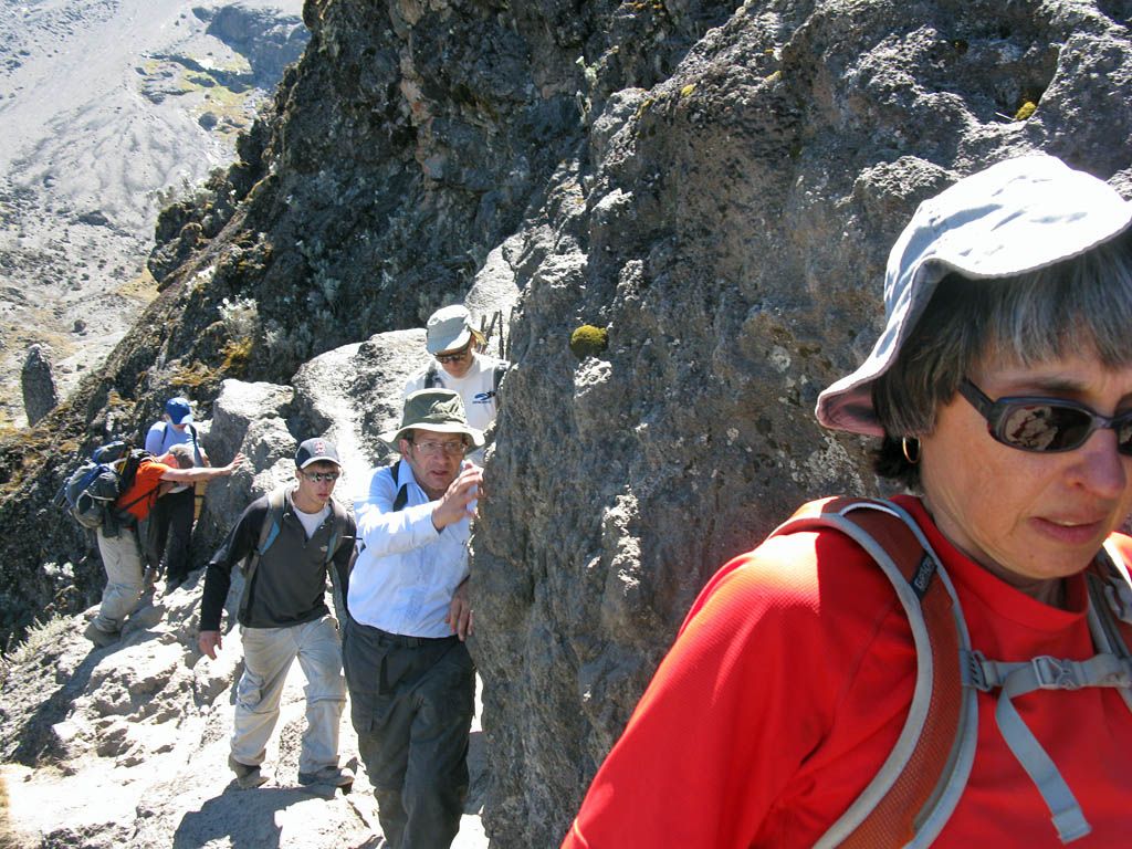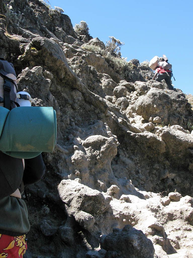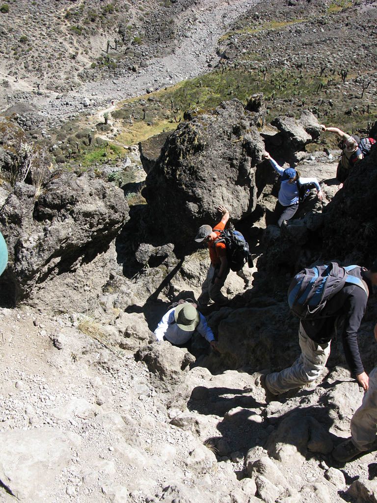Looking up to Barranco Camp and to Kibo from the Groundsel forest. | Climbing the Barranco wall. One of the highlights of the trip. |