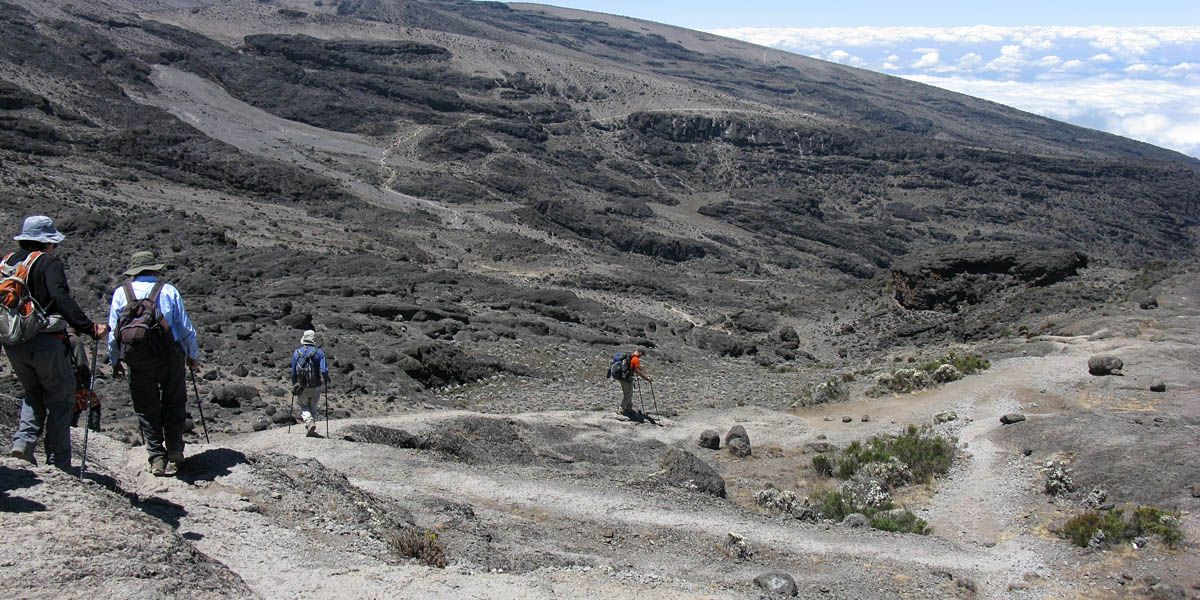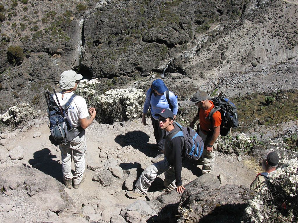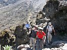 We reached a great lookout point at the top of the Barranco Wall at 12:15pm. Here we paused to eat snacks and drink, and admire the fantastic view in all directions from this point (easily the best of the day). Meru again looked like it was floating on the haze and the cumulus clouds, while Kibo towered majestically above us. The White Necked Ravens were here in large numbers tamely scavenging off scraps dropped by other hikers. We also arranged a group shot with the spectacular backdrop of Meru and the cumulus clouds below us over the plains.