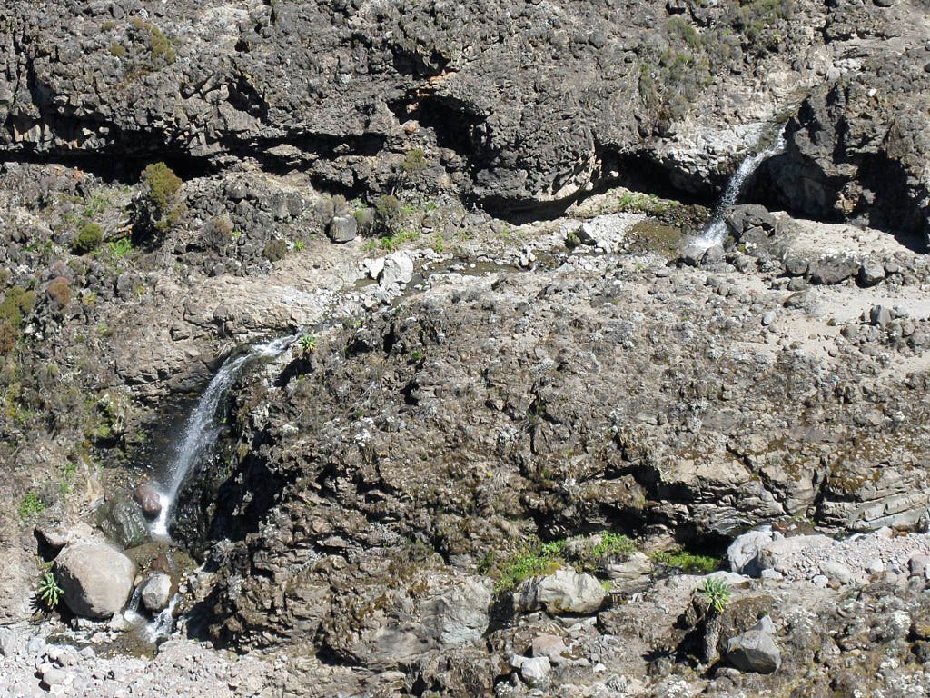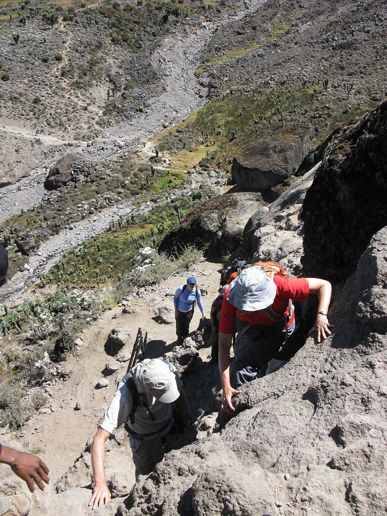 A view from the side of the Barranco wall. | Waterfall below us. | Climbing the Barranco wall. | Looking down at the path between Barranco camp and the wall. | Onwards and upwards! |