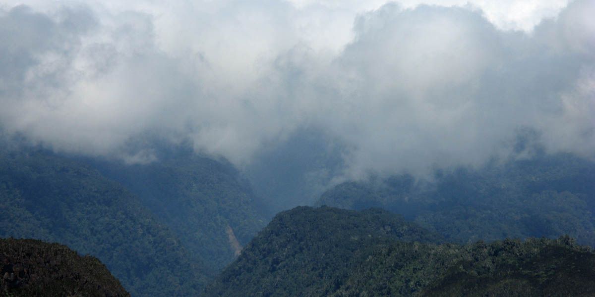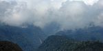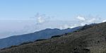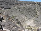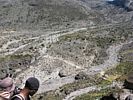 One more panorama before we descend into the Karanga Valley. | Approaching the valley edge and spying the paths on the other side on a steep slope. | Descending into the valley. | Looking down the valley to the clouds below. | The descent is steep and treacherous in places, especially where water makes bare rocks slippery. |