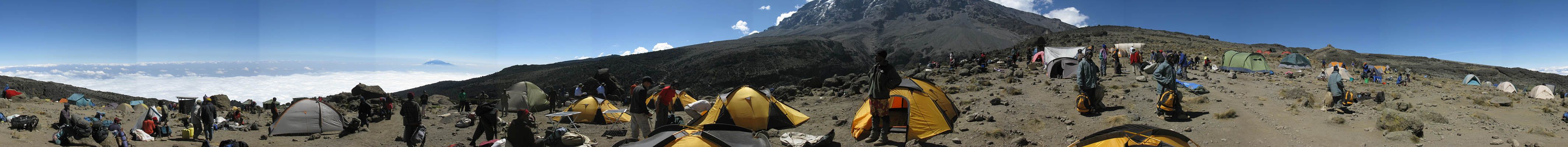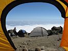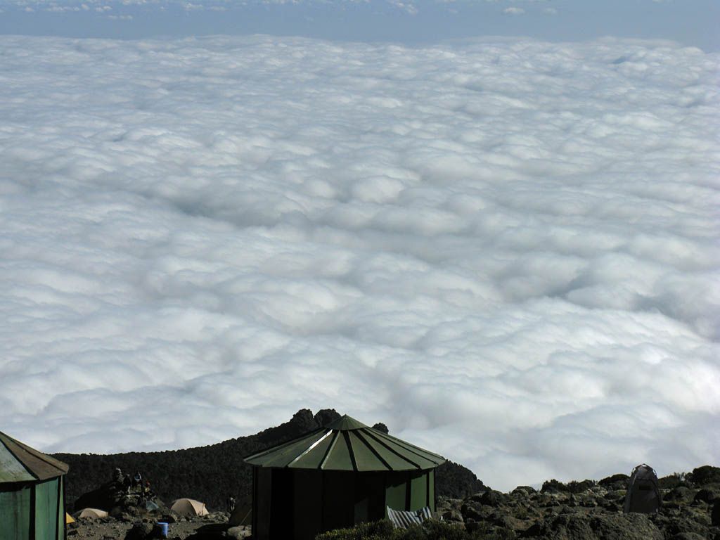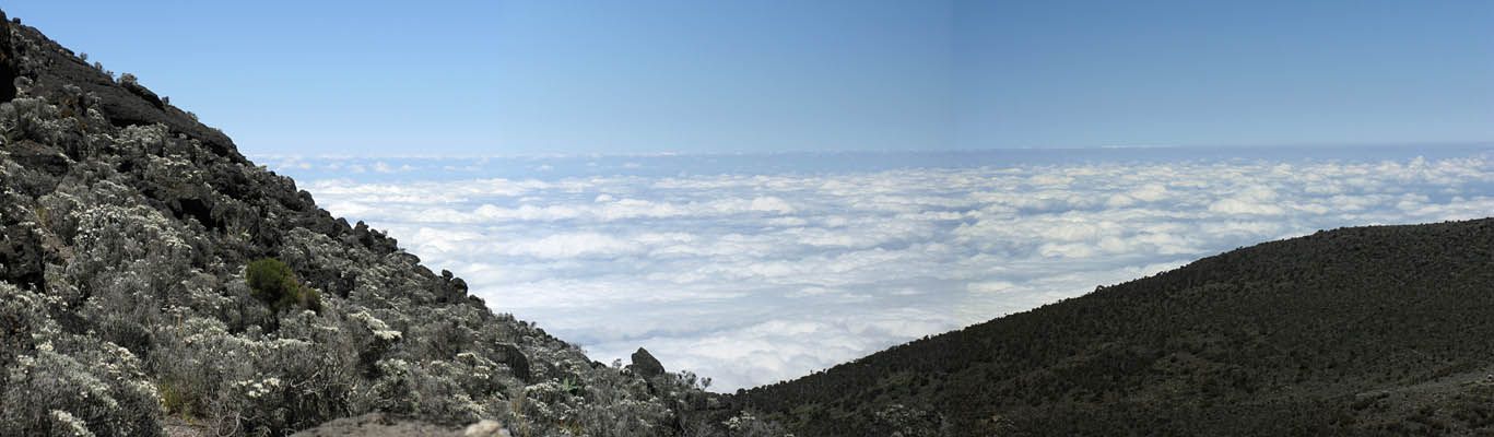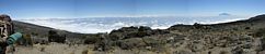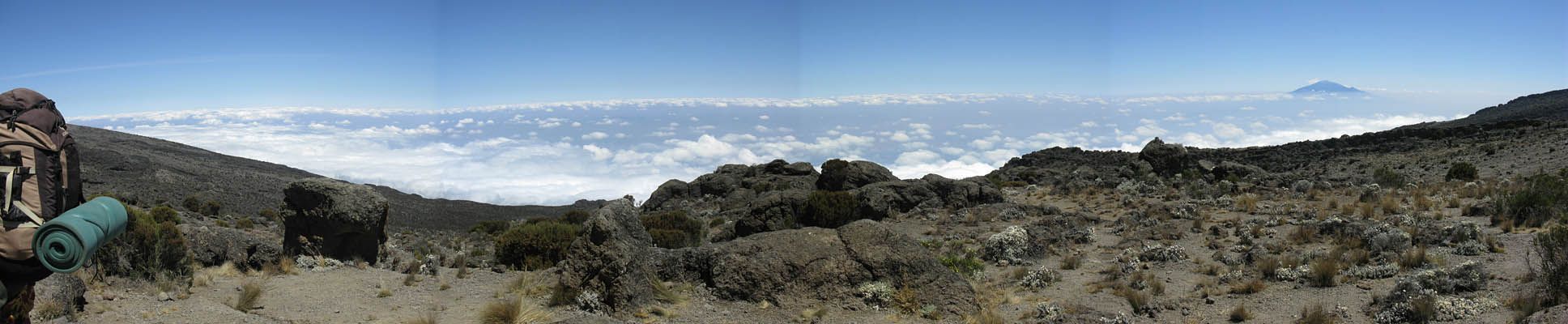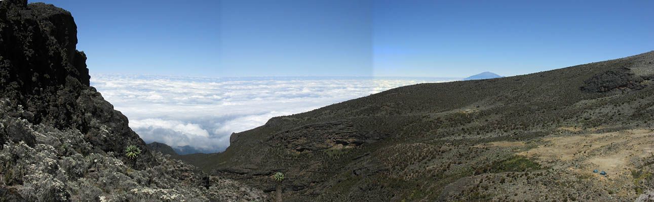 360 degree panorama of Karanga camp site. | Another irresistable view of Mount Meru floating on the haze and the clouds. | Another view above the clouds to the left of Meru. |