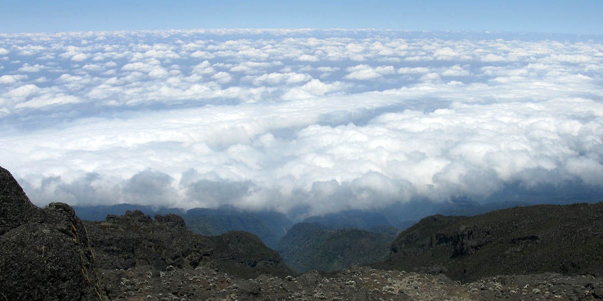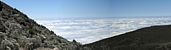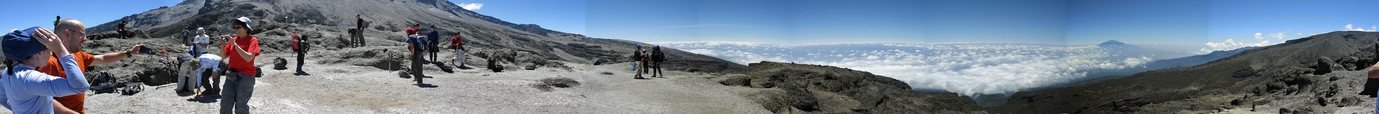 A spectacular 360 degree panorama from the viedw point at the top of the Barranco Wall. | A cumulus cloud sitting on top of Kibo. |