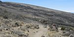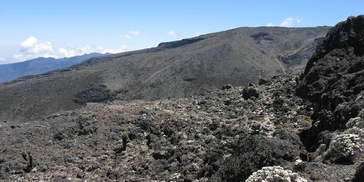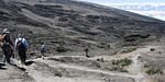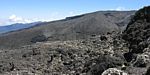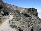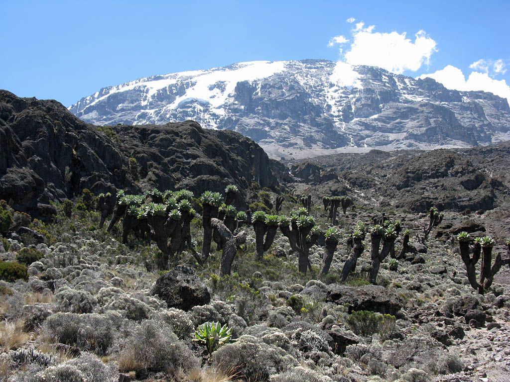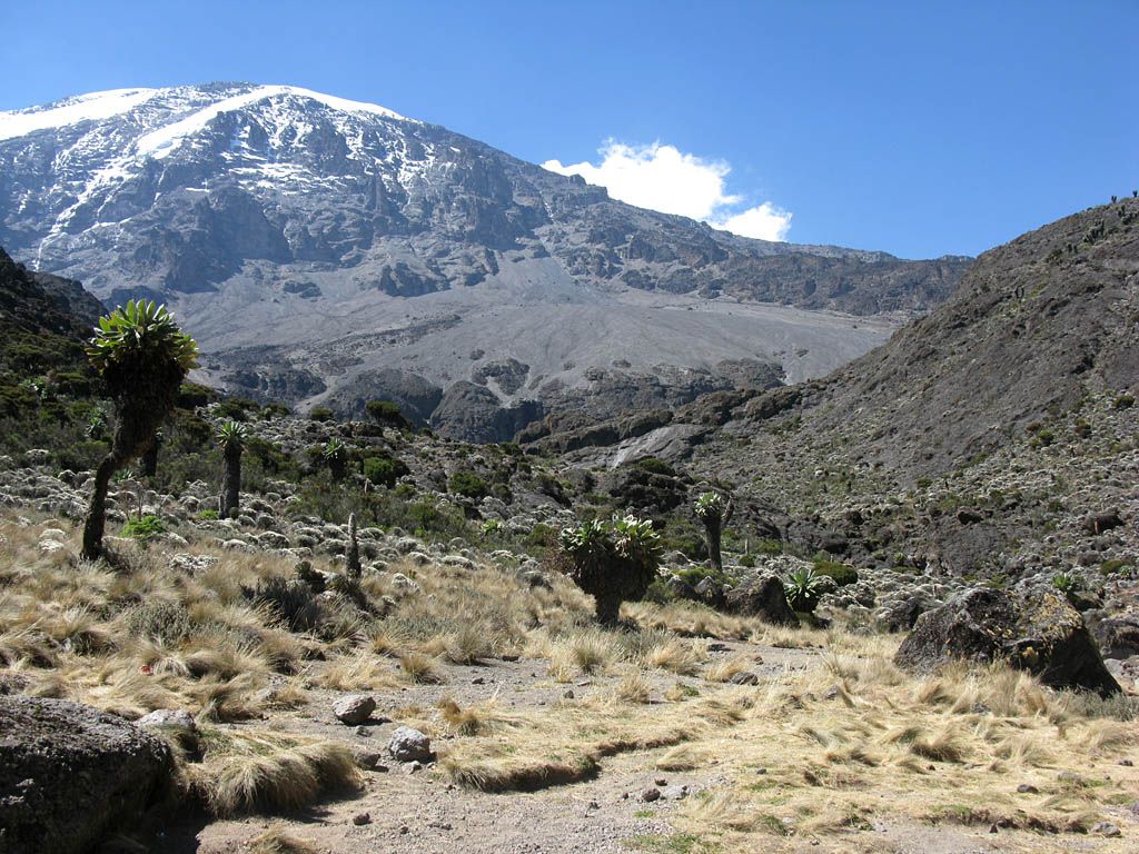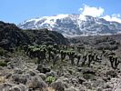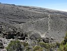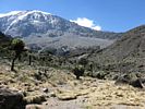 Hiking sticks back out and setting off for Karanga Camp. | Tree Groundsel | Tree Groundsel forest below a view of Kibo. | Everlasting strewn landscape. | Meru continues to float majestically on the haze. | First view of Karanga Camp. What is hard to see here is the steep Karanga Valley slicing its way between us and there. |