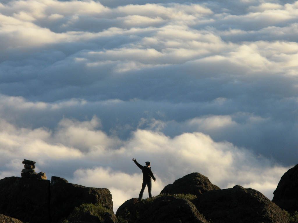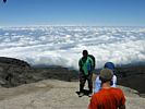 Arriving at a plateau at the top of the Barranco Wall. | There are plenty of White Necked Ravens playing as we eat lunch. | The view of Kibo gets ever more spectacular as we traverse around it. | The gathering cloud forest rain clouds look spectacular from up here. | Me at the top of the Barranco Wall, with Mount Meru in the distance floating on the haze and cumulus clouds below. |