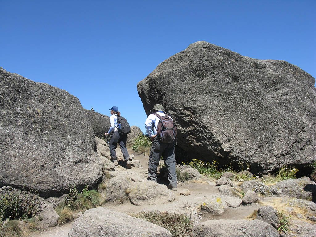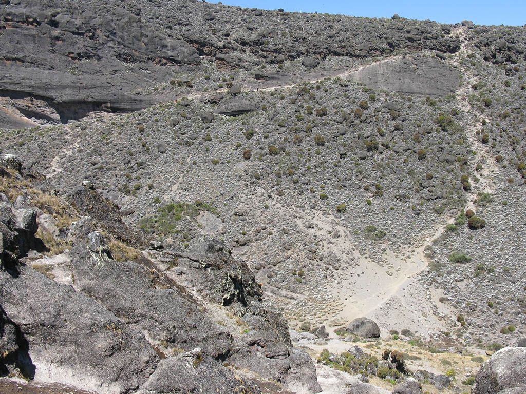 After our pause at the top of the wall, we had a couple of descents and ascents over undulating and Everlasting strewn terrain before we crossed a large sloping plateau. Then Karanga Camp came into view in the distance. At first it looked like a straight forward plod to the site. But as we got closer the steep sloped Karanga Valley also came into view, and this presented a big obstacle between us and camp. Soon we found ourself descending a steep slope, made treacherous in places by water flowing over bare rock. After what seemed like forever, we finally made it to the valley floor. The climb up the other side, however, was much more straight forward, and we arrived at Karanga Camp at 2:40pm, a mere 4 hours after leaving Barranco Camp. That was great after yesterday's marathon!