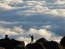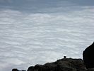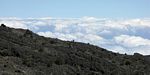 Other hikers walking on past Karanga towards Barafu. We'll be walking that path tomorrow. | Another view of the rain clouds below as they continue to gather. | Those White Necked Ravens are everywhere. | Me in front of the dining tent with the clouds behind and below. | Just checking that I have the correct mountain as described in my guide! | An arty shot of someone posing on a rock above the clouds. |