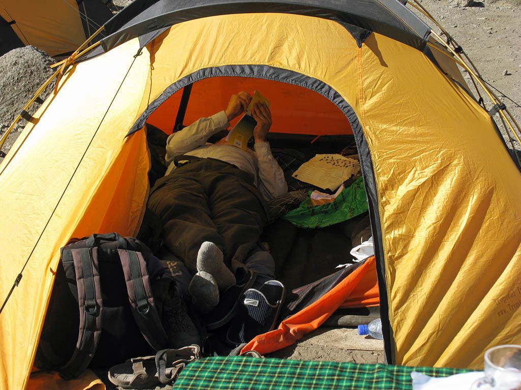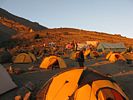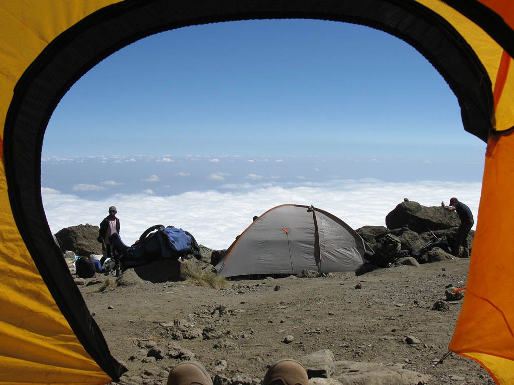 During the afternoon after the late lunch I took it easy, chilling out and taking in the view. I also took some fun arty shots such as the man posing on the rock on the clouds. I also leant my guide book to William, the head guide who kept it overnight and during the hike to Barafu. The sun set just after 6pm as we had supper. Golden hour at Karanga was spectacular, with some lovely cloudscapes and the camp seemingly bathed in a beautiful golden light before the sun disappeared behind the ridge which we had walked over during the day.