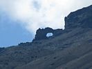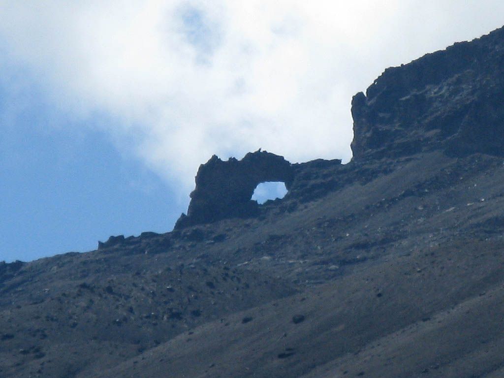 The gathering rain clouds below us. | The view from my tent. | Me with my sun hat on with Karanga huts and clouds behind. | Me with Kibo behind me. | An arch of rock up on the side of Kibo. | A wider view of Kibo. The arch is to the left edge near the snow line. |